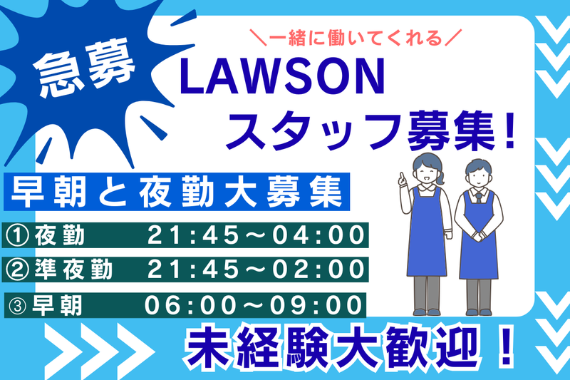 仕事内容 << LAWSONスタッフ >> 早朝と夜勤帯で大募集◎ ✅通勤便利 [ 門真南駅から徒歩30秒 ] ✅週2日~OK、柔軟シフト [ 毎月提出の希望シフト制 ] ✅留学生も活躍中! ◣________________◢ 【仕事内容】 *レジでの接客、お会計 *商品の品出し、陳列 *店内の清掃 *公共料金の支払い受付、宅配便の手配など 最初からうまくできる人なんていないので、 分からないことは素直に質問してOK◎ 真面目に仕事に向き合える方なら大丈夫! 「その人に合ったペースで教えていきたい」と 店長も考えています! まずは簡単なことからゆっくりと 順番に覚えていってください♪ ⭐安心の「必ず2名以上」体制 ________________◢ 「深夜や早朝、1人きりになるのは不安…」 そんな心配は一切いりません! 当店ではどの時間帯も、必ず2名以上のシフトを 組んでいます。トラブル時や困った時も、 すぐ隣に先輩がいるので、防犯面でも実務面でも 安心して働ける環境です。 ⭐頼れるベテランがあなたをサポート ________________◢ 40代のベテランリーダーや、しっかり者の サブリーダーなど、経験豊富な先輩が揃っています。 新人さんのフォロー体制は万全ですので、 「コンビニバイトは初めて」「久しぶりの仕事復帰」 というブランクがある方も、それぞれのペースに 合わせて丁寧にお教えします! ⭐抜群の定着率とアットホームな雰囲気 ________________◢ 当店の自慢は、スタッフ同士の仲の良さです。 以前、店舗が移転した際にも「次もここで働きたい!」 と、ほとんどのスタッフがついてきてくれたほど。 オフの日にみんなで遊びに行くこともあるくらい、 温かくて馴染みやすい雰囲気が自慢の職場です。 \ 夜勤と早朝シフトで大募集! / ―――――――――――――――――― あなたのライフスタイルに合わせて、 以下の3つのパターンから選べます! ①夜勤 :21:45~4:00(火・木・金の募集/週2日~OK!) ②準夜勤:21:45~2:00(水・日の募集) ③早朝 :6:00~9:00(土日専属) 「学校の授業の前に」「深夜に効率よく稼ぎたい」 「本業が終わった後に少しだけ」など、 希望の働き方をお気軽にご相談ください(*^^*)
