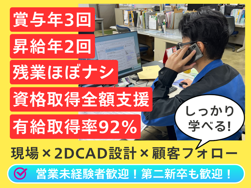 求めている人材 【必須】 ・高卒以上 ・普通自動車運転免許(AT限定可) ・基本的なパソコン操作(Word/Excelなど)ができる方 【歓迎】 ・機械・電気・建設分野に興味がある方 ・CADを使ったことがある方(学校や独学でもOK) ・人と話すことが好きな方 【こんな方に】 ・「営業+技術」の両方に関わりたい方 ・現場を見ながら提案する仕事に魅力を感じる方 ・手に職をつけて、長く働ける環境を探している方 ・人との関係を大切にしながら長く働きたい方 年齢の条件と理由:あり(例外事由3号のイ・35歳未満(長期勤続によるキャリア形成のため))