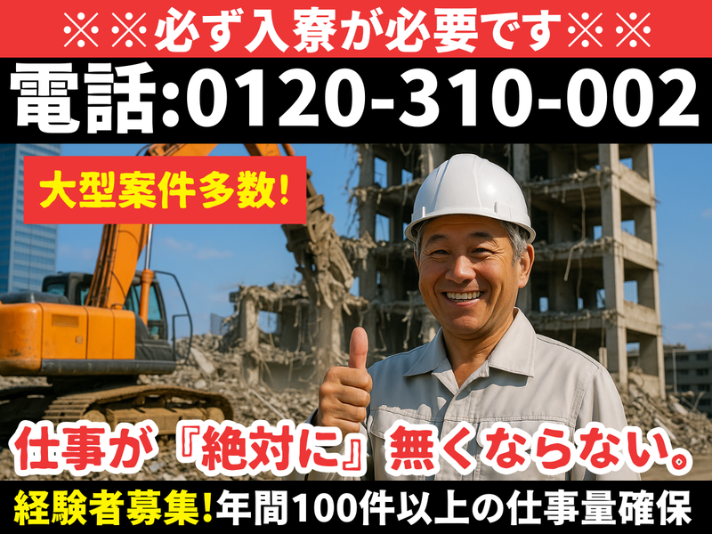 仕事内容 ※入寮必須※設備無料で利用可能! ■お電話での応募はこちら■ ⭐TEL:0120-310-002(田中まで) ⇒フリーダイヤルなので通話料無料! ■LINEでのご応募はこちら■ ⭐チャット(LINE)での応募はこちらから! https://lin.ee/xNtXdQQ ⭐電話(LINE電話)での応募はこちらから! https://lin.ee/oil5k19 ──────────────────── 最近仕事が減って生活できない…ッ! そんなあなたを救います。 ──────────────────── ✅設備はすべて無料で使用可能! ✅会社に大浴場やパチンコ・スロット などの娯楽も完備! ✅電話1本で当日入寮可能! ✅寮費&手作り食事1ヶ月無料 or入社祝金8万円支給が選べる! ✅現金をその場で手渡し日払い可能 ✅メニュー数豊富な手作りごはんあり! ✅「短期で働きたい」もOK! ※最短勤務日数:1ヶ月~ ⭐有給休暇しっかり消化可能!⭐ 法令に則り、きちんと5日以上消化可能! 休みを取ってリフレッシュも可能です! ──────────────────── 絶対に仕事が無くなることはありません。 ──────────────────── 今いるのは小さい会社だし、 仕事がどんどん消えていく… このままだと収入も消えて、 食費すらなくなりそう… ⭐そんな心配は一切無用!⭐ 当社は、東海三県でトップクラスの 規模を誇る会社。 大手ゼネコンから直接仕事を もらっているため、仕事量も超豊富! 国際センターの解体など、 大きな仕事もあり絶対に仕事が無くなる ことはありません! 年間約100件の 安定した仕事量を獲得できています。 ──────────────────── 電話1本で当日入寮OK!※規定あり ──────────────────── □無料Wi-Fi□エアコン□冷蔵庫 □テレビ□洗濯機□乾燥機(コイン不要) □大浴場やスロットなどのゲーム機あり ✅完全個室 ✅設備無料で利用可能 ✅契約が切れて寮を出なきゃ…もナシ ✅清掃員がいるため、共用部は常に清潔 ✅名古屋駅からタクシーで 来社可能(事前相談) ──────────────────── 選べるキャンペーン実施中!※規定あり ──────────────────── ①寮費&手作り食事1ヶ月無料 本来かかる費用『8万円』が丸ごと無料! 生活費が8万円浮くので、その分 働いたお給料がしっかり手元に残ります! ▶こっちを選ぶと、実質日給1万5000円! ※40日間 ②入社祝金8万円支給 2ヶ月で合計8万円支給! (1ヶ月で4万円支給) ──────────────────── 経験者だからこそ好待遇でお迎え! ──────────────────── この仕事、しててよかったー! ⭐日給1万3000円以上!⭐ 建設作業の経験がある方だからこその 好待遇でお迎えします! ⭐現金手渡し日払い可能!⭐ 仕事が終わったら、毎日その場で 現金を手渡しできます! カツカツ生活とはオサラバ! ──────────────────── 仕事内容 ──────────────────── インフラ整備工事から解体、 ビルや駅・公共施設などの 建設工事を幅広く行っております。