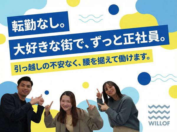 仕事内容 ・。東証プライム上場企業グループ・。 自己PR・履歴書不要「面談」からスタート! ★転勤なし!好きな場所で長く働ける ★未経験7割|自己PR&履歴書不要! ★毎週2日休み&残業1日30分以下 ★「健康経営優良法人2025」に認定! ━━━━━ 仕事内容 ━━━━━ 家電量販店、携帯ショップなどで、 フィールドリーダーポジションとしてお仕事をスタート! 「リーダー」といっても、経験は一切不問◎ 販売方法、メンバー育成のポイント等、入社後に1からスキルを身に着けられます。 ■お任せするのは… ・スマートフォンやインターネット回線等のご提案・販売 ・サービスや操作方法のご案内 ・契約お手続き ・商品の在庫管理や陳列 ・店内のPOPやディスプレイ等の作成 ・スタッフの育成、管理 ・クライアントとのやり取り など ◎最初にビジネスマナーから学べる研修からスタート! ◎徐々にできることを増やしていきましょう! ■売り場作りの例♪ ・商品の魅力を伝えるPOP、ディスプレイを作成 スタッフ同士で意見を出し合いながら、より良い店舗に変えていく楽しみがあります! ■全くの未経験でOK! 充実の研修からスタート◎習熟度ごとに着実にスキルアップ可能です。正社員未経験の方も安心してご応募下さい! ━━━━━━━━━━━━━━ キャリアは入社後に考えればOK! ━━━━━━━━━━━━━━ 「5年後、どうなっていたい?」 なんて、今は答えられなくて大丈夫です。 将来のビジョンを語るより、 まずは地元で、慣れ親しんだ街で、 腰を据えて働いてみる。 現場のプロを極めるのもいいし、 いつか別の道に挑戦したくなったら、 手上げ制でキャリアチェンジをすることができます。 本社の人事担当、人材コーディーネーター等 【20通り以上】のキャリアパスをご用意しています! ━━━━━━━━━━ 転職相談で内定?! ━━━━━━━━━━ ウィルオブ・ワークの選考は、面接ではなくカジュアルなWEB面談からスタート。 社員が皆さんに会社の事を説明させていただく場でもあるので、 事前準備は一切不要です! まずは転職相談をするつもりで、カジュアルな面談にお越しください! \\ 先輩たちに聞いた! // 『ウィルオブに入社を決めた理由TOP3』 1位:キャリアパスの豊富さ 2位:プライム上場企業グループの安定基盤 3位:面談の雰囲気・人柄の良さ ======================= こちらの求人は〈無期雇用派遣〉です。 無期雇用派遣とは「株式会社ウィルオブ・ワーク」の正社員として入社し、 取引先企業様に派遣する働き方です。 =======================