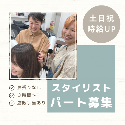 スタイリスト|土日祝時給UP|車通勤可|居残りなし|WワークOK 地元で働きたい方はぜひお気軽にご応募ください! 「あんまり経験はないけどチャレンジできるかな…」 「久しぶりの仕事復帰だけど大丈夫かな…」という心配は一切いりません! ○未経験&ブランクありでもOK ○育児・介護と両立したい ○時短勤務、扶養範囲内での勤務OK 当店では育児中のママさんスタッフもイキイキと活躍中! みんな自分のペースで私生活との両立をしています。 技術を少しずつ確認しながら入客する事もOK! 働き方や不安なことは何でもご相談ください♪