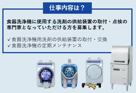 仕事内容 \ ✨働きやすさ改革実施中✨ /  ̄ ̄V ̄ ̄ ̄ ̄ ̄ ̄ ̄ ̄ ̄ ̄ ̄ ̄ ̄ ̄ ⭐「直行直帰」が基本スタイル! 会社に寄る移動時間をカット。 自宅から現場へ、現場から自宅へ。 自分の時間を最大化できます! 担当エリアも居住地を考慮します。 ⭐年間休日124日&土日祝休み! 完全週休2日制で週末は確保。 GW・夏季・年末年始もしっかり。 プライベートも大切にできる環境。 ⭐賞与実績3.3ヶ月分&手当充実 月給に加え、年2回の賞与あり。 昨年度実績は計3.3ヶ月分! 家族手当はないものの、 安定した収入が得られます。 ┏━━━━━━━┓ ◆ お仕事内容 ◆ ┗━━━━━━━┛ 大手洗剤メーカーの商品を使う 飲食店や病院、施設等を訪問し、 「業務用食洗機」のチェックを お願いします。 ✅:具体的には… ・洗剤を送る装置の取付 ・洗剤の濃さの設定確認 ・機械の調子を見るメンテナンス ・簡単な部品交換 など ※エリア:東京23区・横浜・川崎 ※社用車での移動となります 「チェックリスト」に沿って 確認する作業がメインです! 未経験から始めた先輩ばかりなので 機械に詳しくなくても大丈夫です。 ~~~ 1日の流れ(例) ~~~ 09:00 / 自宅から現場へ直行 担当エリアのお客様先へ訪問。 ▼ 12:00 / お昼休憩(1時間) 自分の好きなタイミングでOK ▼ 13:00 / 午後の訪問スタート 数件のお客様を回ります。 ▼ 17:00 / 最後の訪問終了 日報報告(スマホ等で完了!) ▼ 17:25 / そのまま直帰! ※残業月20h以内と少なめです ~~~~~~~~~~~~~~~ ┏━━━━━━━━┓ ◆ 当社について ◆ ┗━━━━━━━━┛ ✅全国物流網を持つ「諸星グループ」 の一員として安定経営を継続中。 大手メーカーの業務用洗剤や 消耗品を扱う専門商社です。 ✅取引先は大手外食チェーンや 医療・介護施設など多数。 景気に左右されにくい 「食」と「衛生」に関わる事業で 腰を据えて長く働けます。 HP:https://www.teepol-s.jp/