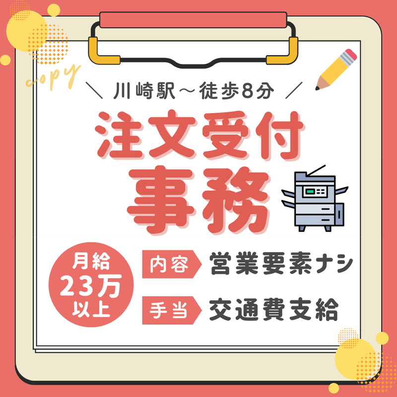 仕事内容 【大手OA機器メーカーでの受発注事務】 大手メーカーのオフィス用品に関する 注文受付やデータ入力などの事務業務をお任せします。 担当するのは、取引のある法人のお客様からのご注文対応。 営業要素は一切なく、コツコツ・丁寧に進めるお仕事です◎ 【主な仕事内容】 ◆ 注文受付(FAX・専用サイト) カタログや専用用紙をもとに注文内容を確認します。 ◆ データ入力・在庫確認 専用システムに入力し、在庫や納期をチェック。 ◆ 納期連絡・配送手配 お客様へ納期をお伝えし、スムーズな納品をサポート。 ◆ EDI(電子データ取引)対応 受注書のダウンロードや、Excel(マクロ)を使ったデータ処理。 返品や代替商品のご案内も行います。 ✨ 電話対応は既存のお取引先のみ! 決まった企業様とのやり取りが中心なので安心です。 マニュアルやチーム体制も整っており、 分からないことはすぐに相談できます◎ - ◇アピールポイント ⭐未経験でも安心スタート! 分からないことはすぐに聞ける雰囲気♪ チームで協力しながら進めるので、初めてでも安心です。 ⭐ 女性スタッフが多数活躍中! 20代~40代の女性が中心。 家庭と両立しながら長く働く方も多い職場です。 ⭐ スキルに応じて時給アップも! 業務の幅を広げたり、マクロ操作などを習得すれば しっかり評価される環境です。 ⭐ 通勤&環境バツグン! 川崎駅チカでアクセス便利。 ラゾーナやアトレなど商業施設も充実していて、 ランチや仕事帰りの買い物も楽しめます♪ ⭐ 安定企業で長く働ける! 大手メーカーでの勤務なので安心。 長期的に事務スキルを磨きたい方にもピッタリです! - 大阪に拠点を置いておりますが、東京エリアでのご紹介・ご入社実績も多数ございます。 東京の企業さまとのつながりも多く、これまでにも多くの方が首都圏の職場でご活躍中です。 面談はすべてオンラインで対応しておりますので、場所を問わず安心してご相談ください!