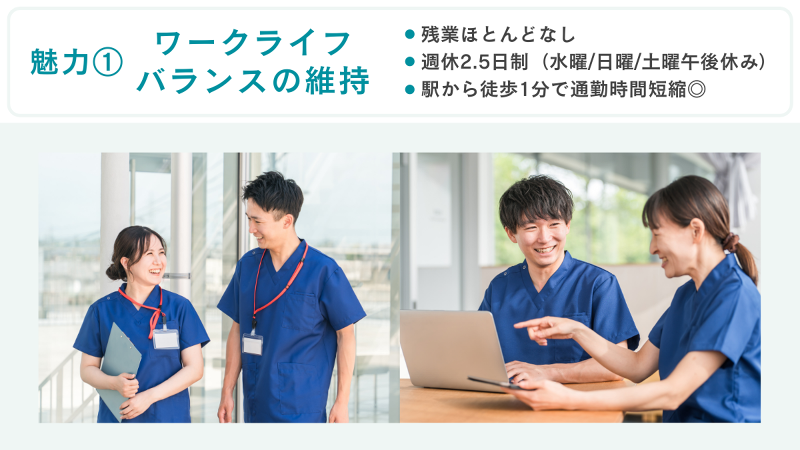 勤務時間・曜日: 【勤務時間】 9:00:~18:00(休憩時間1時間) 【休診日】 週休2.5日(毎週水・日・土曜午後固定制)