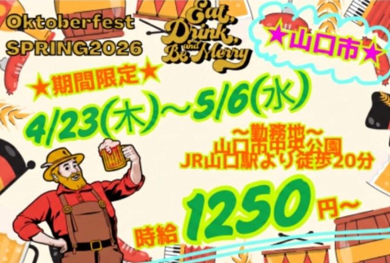 仕事内容 ✨ドイツビールとフードの祭典✨ ★☆★山口オクトーバーフェスト2026★☆★ ★★☆ 大募集 ☆★★ ドイツを感じる!楽しめる!味わえるイベントです♪ 山口市中央公園(山口市中園町7)にて、お祭りが楽しめる♪ 仕事は、お会計、ドリンクを注ぐ、料理を盛り付ける、販売等簡単なお仕事です。 飲食物の販売スタッフ募集となります。 時間、曜日等は相談が可能ですので、 フリーターさんや学生さんも働きやすい環境ですよ◎ <楽しい空気で働ける!> お客様の笑顔や楽しそうに商品を選んでいる姿が沢山みられる… 楽しい空気の中で働けます♪ 活気溢れる空間で働いていると時間はあっという間です☆ イベント好きの気の合う仲間とも出会えるかもしれません★