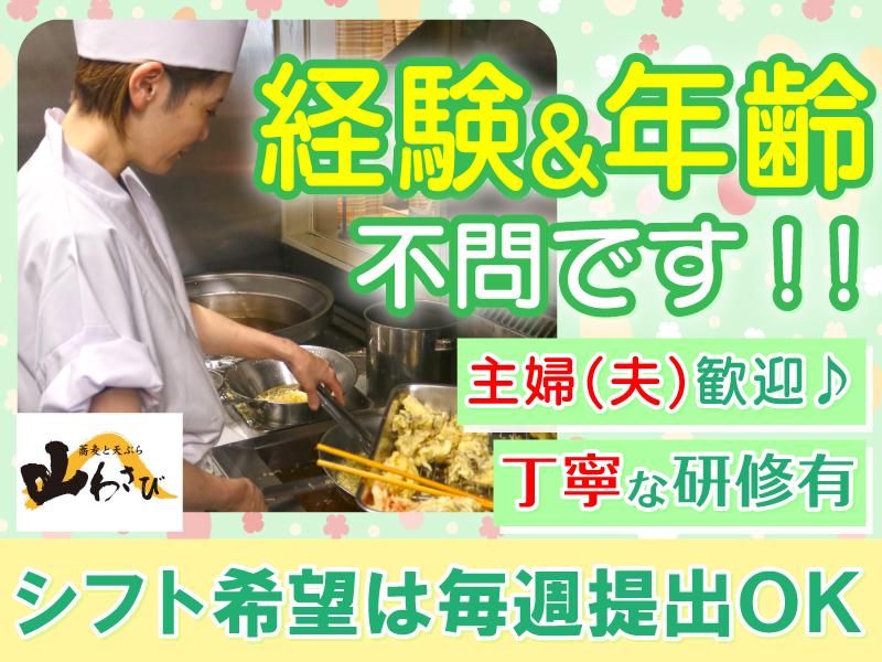 求めている人材 / リニューアルOPENに伴い、 新メンバーを大募集します! \ 【応募条件は・・・】 *特にナシ!飲食・調理未経験も大歓迎! *経験者の方もブランクがある方も大歓迎! <志望動機も特に必要ナシ!> 「家から近いから応募しました」 ・・・これが一番多い理由です(笑)。 そのため、山わさびでは志望動機は 特に重要視していません! *オープニング募集だから *蕎麦・和食が好きだから *友達に紹介されたから ・・・など、 何でもOKです!まずはお気軽にご応募ください。 【こんな方歓迎&活躍中!】 *主婦(夫)パートさん活躍中!扶養内勤務OK! *フリーターさん大歓迎! *大学生・専門学生さん大歓迎!(新入生も歓迎) *蕎麦・和食が好きな方大歓迎!(まかない無料) *ご友人・知人同士のご応募も歓迎します! <下記に該当する方もぜひ!> *カフェやビアガーデンなどでの調理経験者 *ファミレスやラーメン店など別業態の経験者