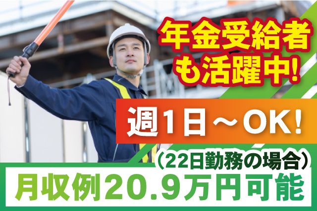 仕事内容 週1日~勤務可能なので ちょっとしたお小遣い稼ぎにも! 船橋市内にて工事現場などでの 交通誘導スタッフ大募集! 50代、60代、70代以上のスタッフ活躍中! 80代の方もご相談ください。 シニア世代で未経験の方が 多数スタートしています。 年金受給しながらセカンドキャリアとして 多くの方に選ばれてます。 フルタイムで働く方は月収20.9万円可能! <オススメPOINT> ・65歳以上・70歳以上活躍中 ・Wワーク(副業)OK ・日給保障有!(現場が早く終わっても安心) ・週1日~勤務OK ・女性スタッフも活躍中 ・毎日同じ場所で働くので安心! ・交通費全額支給!車(マイカー)通勤OK <仕事内容> 交通誘導警備員として、車の動きや 人の出入りを安全に誘導するお仕事です。 勤務地は、船橋市内近隣エリアとなります。 その他にも、千葉市中央区・浦安市・市川市 習志野市エリア等もございますので お気軽にご相談ください。 基本的には、近隣エリアで就業できるように 配慮させていただきます。 1つの現場で固定のため、 他の現場への応援はありません。 毎日同じ場所で働くことができます。 ※直行直帰もOKです! 〈魅力の待遇〉 (1) 日給保障がありますので、 早く現場が終わっても安心です。 (2) シフトは自己申告制 週1日だけ働きたい…といった方から、 しっかり週5日働きたいといった方まで 多様な働き方ができるのが特徴です。 (3) 頑張るシニア世代を応援します。 60代以上の方で初めての方も多数活躍中! 同世代の仲間ができますよ。 当社は、ミドルシニア層の採用率が高めです。 (4) 直行直帰・車(マイカー)通勤OK (交通費全額支給) 現場への送迎もあります。 (5) 週払い制度 急な出費の際も週払い可能 (6) 丁寧な研修制度あり 無資格・未経験の方も現場へ配属される前に 事前研修と数日~2週間(日給保証)の 現場研修を行いますので 安心してお仕事を始めることができます。 2~3名のチームで作業しますので、 分からないことはすぐに聞ける環境ですよ。 <まずはお気軽にご応募ください> ・お問い合わせだけでもOK! ・入社時期も柔軟に対応いたします ・お電話でのご応募も受付中! TEL:043-441ー4670