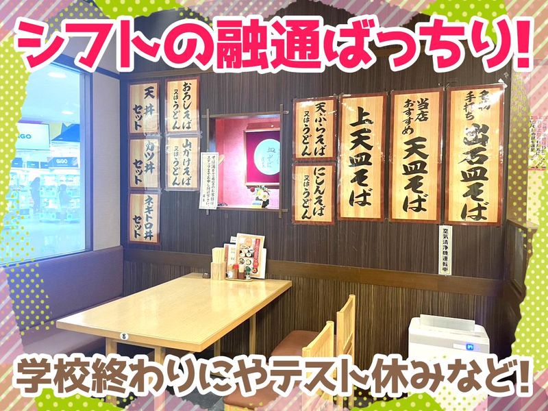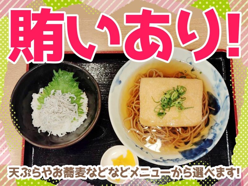 仕事内容 《シフト融通抜群!短時間勤務・がっつり勤務もOK!》 《まかないは無料でお腹いっぱい食べれる!》 《週2日~OK!ピアス・髪色髪型自由!》 - 【お仕事内容】 ・お客様のご案内 ・オーダーの受け付け ・料理やドリンクの提供 ・お蕎麦を湯がいたり・冷水で締めたりなどの カンタンな調理補助業務 《未経験&初バイトもOK!》 初めは先輩スタッフが丁寧にお教えするので 安心してご応募くださいね! 一度働き始めると卒業まで続くスタッフ多数! 同世代のスタッフも多く、 和気あいあいとした雰囲気で居心地もピカイチなお店です★ イオンモールの中なので休憩中やバイト前に買い物したりカフェに行ったり、仕事以外でも楽しめます('▽'・) 幅広い年代のスタッフが、協力し合いながら活躍中。いつも和やかな雰囲気なので、未経験や初バイトの方もご安心を!! - 【スタッフが学校卒業のため久々の大募集!】 スタッフのオススメPoint1:選べる美味しい賄い付き! 「今日は丼ぶりと~温かいそばで」「サバの煮つけも余ってるから食べてええで~」こんな感じ お仕事終わりの賄いを楽しみに…仕事も頑張れます(笑) オススメPoint2:シフトは融通。 スタッフでグループチャットを作っているので、「シフト変更したい~」っていう時も気軽に相談ok! 希望シフト制だから、スケジュール管理もバッチリ! 駅チカ・学校帰りにサクッとお仕事もOK! 休憩や仕事終わりに買い物もできるので、何かと便利。 駐車場があるのでマイカー通勤もOK!