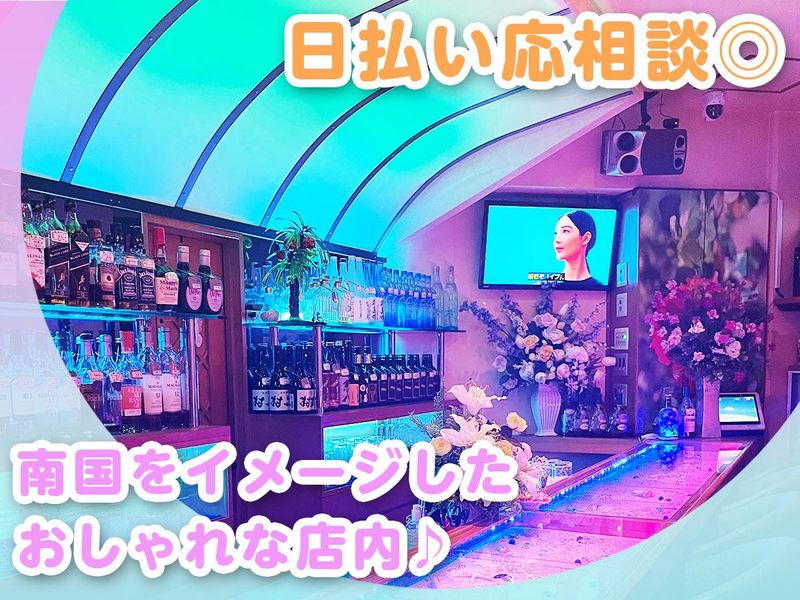 職場環境 沖縄・竹富島の星の砂を散りばめた 砂浜のカウンターや 虹色照明などお洒落な南国雰囲気のお洒落な店内が自慢! 「本当に沖縄に来たみたい♪」と お客様やスタッフから好評です☆ おっとり優しいママを中心に 和やかな雰囲気で営業中!!