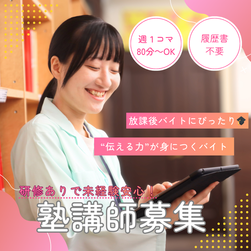 仕事内容 +ー+ |学ぶことや教えることが好きな方集まれ!| |塾講師経験がない方も安心してスタート◎| |就活に活かせるスキルやノウハウを習得可| +ー+ <以下のいずれかを満たす方必見!> ①現在大学・短大に通われている方 ②大学、短大を卒業された方 ▶▶ この求人のアピールポイント ◀◀  ̄ ̄ ̄ ̄ ̄ ̄ ̄ ̄ ̄ ̄ ̄ ̄ ̄ ̄ ̄ ̄ ̄ ̄ ✅講師経験不問!未経験スタート多数活躍 ✅週1コマ・週3日勤務など選べる働き方 ✅キャンパス変更による教室の移動可 ✅テスト期間や履修状況を最大限考慮 ✅副業・WワークOK!隙間時間を活用可 ✅コーチングスキルが育める教育総合企業 \\\仕事内容/// ┏━━━━━━━━━━━━┓ 個別指導塾にて小中学生個別指導 ┗━━━━━━━━━━━━┛ <先生1人&最大生徒3人まで!!> 1コマの授業はセミ個別指導で80分。 個別指導向けのマニュアルがあるので、 安心して授業を進めていただけます。 <以下の方が中心に活躍中> ・学校終わりの時間で働きたい学生さん ・経験を活かしフルタイムで働く主婦さん ・隙間時間を有効活用したいWワーカーさん ⭐具体的には・・⭐  ̄ ̄ ̄ ̄ ̄ ̄ ̄ ̄ ̄ ̄ ̄ ̄ ̄ ̄ ̄ ̄ ●指導教科 小学生は算数/国語が中心 中学生は英語/数学が中心 そのほか、得意教科に応じて指導を お願いすることがあります。 また、指導教科に関しましては お気軽にご相談下さい。 (厳密に担当教科は定めておりませ んので、「他の教科もチャレンジし てみたい!」というご相談も大歓迎 です!) ●指導方法 生徒が持つテキストに沿って進めます。 授業のオペレーションマニュアルや 実際の授業を担当するまでに研修も 実施しますので、安心して授業に 臨んでいただけます。 *新人研修や現場研修などもあるので 「経験が無い…」という方もご安心を◎ イチから丁寧にお教えしていくので お気軽にご応募くださいね! ⭐1日の流れについて⭐  ̄ ̄ ̄ ̄ ̄ ̄ ̄ ̄ ̄ ̄ ̄ ̄ ̄ ̄ ̄ ̄ ■準備 タブレットから生徒情報をチェック。 進路や学習状況を確認して、 その生徒さんの状況を事前に確認。 ■授業(80分制) 基本は生徒最大3名を担当。 事前に決めた時間帯に授業の実施をお願いします! 生徒が持つテキストに沿って進めます。 授業のオペレーションマニュアルや 実際の授業を担当するまでに研修も実施しますので、 安心して授業に臨んでいただけます。 ⭐入社後の研修について⭐  ̄ ̄ ̄ ̄ ̄ ̄ ̄ ̄ ̄ ̄ ̄ ̄ ̄ ̄ ̄ ̄ ■事前研修 マニュアルがしっかり身につく研修! とにかく「褒める」を大切にした研修です。 ____________________ ■社員インタビュー(20代女性/大学生)■  ̄ ̄ ̄ ̄ ̄ ̄ ̄ ̄ ̄ ̄ ̄ ̄ ̄ ̄ ̄ ̄ ̄ ̄ ̄ ̄ 大学の友達に勧められて始めました。 サークルや授業があるのであまり入れませんが 週1日でも働けるのでありがたいです。 他の大学の生徒と交流したり 就職活動の情報を交換したり出来ることも 塾ならではだなと思います。 「テストの成績が上がった!」と 教えている生徒から報告をもらった時は 自分の試験の結果よりも嬉しかったです。笑