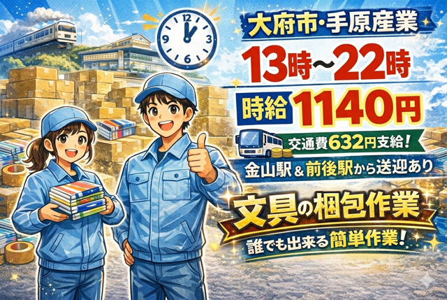 仕事内容 \\人気のコツコツ軽作業♪文具の仕分け・梱包// 未経験からでもすぐに覚えられるカンタン作業! 安定して長く働きたい方にピッタリ◎ ◆週3日~OK(平日のみ)で予定が立てやすい! ◆13:00〜21:00のゆったり午後スタート♪ ◆昇給あり!頑張りはしっかり評価◎ <お仕事内容> 文房具を扱う物流会社の倉庫内での軽作業です! 軽い商品がメインだから体への負担は少なめ♪ ◆梱包 段ボールやクッション材・ビニール袋を使って、 文具が安全に届くように丁寧に包装します! ◆仕分け 伝票やリストを見ながら、 商品を指定の場所に振り分ける作業です◎ 「モクモク作業が好き」「安定した環境で働きたい」 そんな方、大歓迎です♪ <1日の流れ> 同じ勤務先のスタッフと 勤務地近くで集合 ▼ 全員揃ったら勤務先へ移動 ▼ 朝礼&お仕事開始 ▼ お昼休憩 ▼ 作業終了&終了報告 ▼ 給与予約 ※スタッフ登録が完了していれば お友だちとの就業も可能です♪ <ほかにもこんなお仕事あります◎> ◇物流倉庫の梱包 ◇食品の仕分け作業 ◇飲料の出荷作業 など…