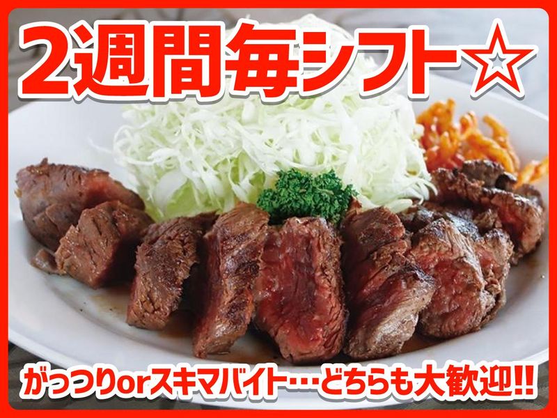 仕事内容 「学校終わりに18時~」 「土日のみ」「本業の後に」などok 柔軟シフトでプライベートと両立◎ オーダー取りや配膳、レジ等。 まずは配膳や片付けなど簡単なことからお教え! メニューは手書きなのでハンディー操作を覚える必要なし! 明るく「いらっしゃいませ!」が言えたらOK! 先輩スタッフが隣についてお教えします。 希望を伺って上で、ホールが慣れてきたら 調理補助等のキッチンもお教えします! <初バイトも安心♪> スーパー内の店舗で、お客様はファミリー層が中心です。 22時閉店で帰りも遅くならないので、 「ここなら安心」と親御さんに勧められて勤務を始めたというスタッフもいます◎ がっつりバイトorスキマ時間にちょこっとバイト、どちらも大歓迎! ★昼と夜で通し勤務の日は<まかない>が出ます♪ ⇒ガッツリ働きたい人は、お給料もまかないもどっちもゲット出来て一石二鳥! <スタッフより> ■テストや実習など学校行事に合わせてシフト調整できるので、学校と両立できています。/by学生スタッフ ■スーパー内にあるので帰りに寄って夕飯の買い物もできますよ◎/by主婦パート ■社割でお得にステーキが食べられます!家族分も割引してくれるのでみんな大喜びです(笑)/byフリーター