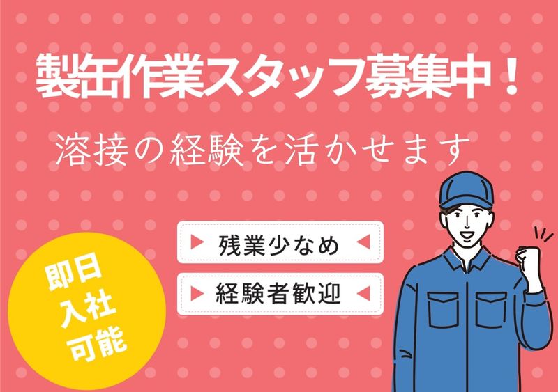 仕事内容 〓〓 お仕事内容詳細 〓〓 倉庫内で燃料やオイル、油を入れるタンクの組立作業を行うお仕事です。 ・溶接(スポット)等を使用しての組立作業 ・専用の機械を操作しての組立作業 ・リフトを使用しての運搬作業 ・適正に応じてプレスや塗装の作業もあります ・その他付随作業 等 溶接の経験があれば経験が活かせるお仕事です。 フォークリフト免許があれば運搬作業も行って頂きます。 フォークリフト免許はなくてもOK 〓〓 ポイント 〓〓 ・日勤勤務 ・土・日・祝・他休み(土曜日は会社カレンダー) ・年末年始等長期休暇あり ・制服貸与 ・溶接経験 ・フォークリフト免許はあればなお可 ・幅広い年齢層で活躍中! 〓〓〓〓〓〓〓〓〓〓 職場見学ができるので、安心して就業開始が可能! お問い合わせ・ご応募お待ちしております(^^)/