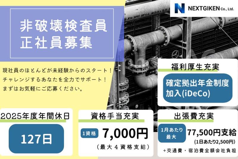 仕事内容 未経験からプロへ!! 知識や経験は、一切問いません! 先輩たちの前職も、飲食店や事務など様々。 「機械はニガテ…」そんな方も大丈夫。 景気に左右されない安定した業界で、 一生モノの技術を身につけませんか? 【当社の自慢をご紹介します】 □未経験から資格取得も目指せる! □年間休日127日(2025年度) □残業月平均20h以内 □賞与年2回 □家族手当、住宅手当など、福利厚生充実 □転勤無し、UターンIターンも大歓迎 【どんなお仕事?】 例えるなら『社会インフラの健康診断』 鉄道、発電所、工場内などにおいて 建物や機械を壊さず、特殊な機械を使い 目に見えない内部のキズを 発見、報告する定期点検業務となります。 人々の安全な毎日を守る、大切なお仕事です。 【具体的な仕事の流れ】 ▼STEP1:まずは準備から 先輩の指示通りに機材を用意したり、 検査結果をメモすることからスタート! ▼STEP2:チームで検査 慣れてきたら、先輩とチームを組んで 実際に検査に挑戦。やり方は丁寧に教えます。 ▼STEP3:報告書の作成 検査結果をフォーマットに入力し報告。 PCスキルは文字入力ができればOKです。 【使命感とやりがい】 工場やビル建設など たくさんの人が関わる場所のため 「多くの人の命を守っているんだ」 という使命感とやりがいを 感じながら働けるお仕事です。 【この仕事ならではのワクワクも!】 鉄道車両の車庫や、発電所の内部、 人気テーマパークの裏側など…。 普段は絶対に入れない特別な場所が、 あなたの職場になることも! ちょっとした探検気分を味わえます。 【景気に左右されない安定した業界】 車に車検があるように構造物にも 法令による検査が定められているため この仕事は景気や情勢に左右されません ◆検査対象 ・鉄鋼製品溶接部 電車部品・石油タンク・発電所タービンなど ・コンクリート構造物 トンネル 柱 橋 外壁など ◆検査方法 ・超音波探傷 ・磁粉探傷 ・浸透探傷 ・エックス線撮影 ・渦電流探傷