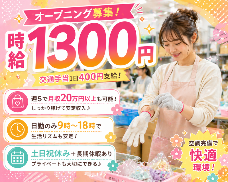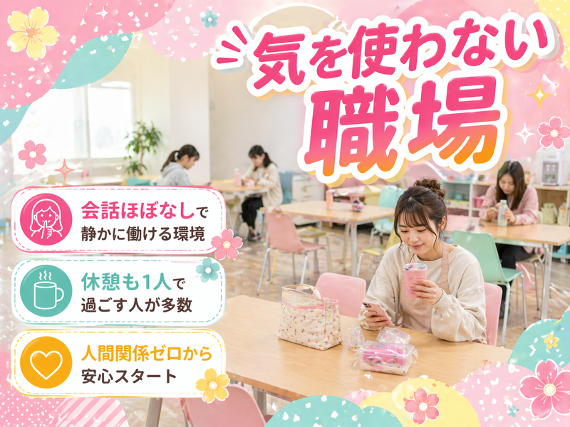 仕事内容 ━━━━━━━━━━━━━ ◎【人間関係ゼロで始める新センター】 ━━━━━━━━━━━━━ ▼ストレスがない働き方へ ✅ 2026年5月スタートの新センター! ✅ 最大100名が全員同時スタート! ✅ 雑貨を袋につめる等、カンタンな軽作業のみ ✅ 分業制で個人完結のシンプル作業! つまり… 最初から人間関係ができていない状態で働けます!✨ 初日は、 みんな同時にスタートします! でも… 誰も話しかけてこない。 ただ、それぞれが 静かにコツコツと作業しています。 休憩中も、 一人で過ごしている人がたくさん♪ それがこの職場の【普通】です! 「人に気を使わない」 そんな働き方がここにあります!✨ ━━━━━━━━━━━━━ ◎【具体的なお仕事内容】 ━━━━━━━━━━━━━ ▼シンプル軽作業 (雑貨・食品の梱包・セット作業) どれも決まった手順で進める作業なので、 未経験でもすぐ慣れます◎ 【落ち着いてコツコツ続けられる】仕事です!✨ ━━━━━━━━━━━━━ ◎【ここが安心ポイント】 ━━━━━━━━━━━━━ ・大型センター! ・最大100名の同時スタート! ・空調完備で快適&清潔✨ ・重たい物なし&汚れなし! 人数が多い職場なので、 一人ひとりが目立つことはありません◎ 人との深い付き合いが苦手な方、 注目を浴びるのが苦手な方も、 無理なく活躍しています◎ 実際に 20代・30代・40代・50代・60代まで 幅広い年代の方が活躍中!✨ 年齢に関係なく、 無理なく続けられる環境です♪