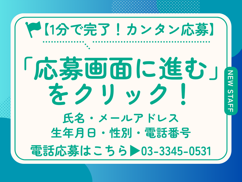 選考プロセス ネットからのご応募は24時間受付中! 「応募画面へ進む」ボタンから 簡単にご応募いただけます。 ┏━━━━━━━━━┓ ⭐ 応募後の流れ ⭐ ┗━━━━━━━━━┛ ✅応募内容を確認後、追って こちらからメールまたはお電話にて ご連絡いたします。 ✅面接 …お給料・仕事内容・待遇・ 職場のことなど、気になることは 何でも聞いてください。 ✅内定! 面接日・勤務開始日は相談に応じます。 お会いできるのを楽しみにしています! *採用が決定次第応募は締切になります のでご了承ください。