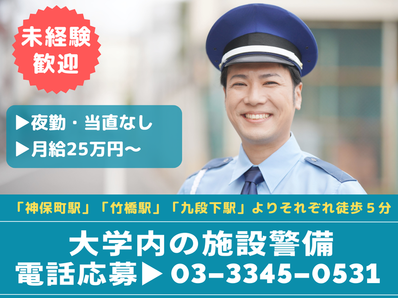 仕事内容 *.·┈┈┈┈┈*.·┈┈┈┈┈*.·┈┈┈┈┈*. ✨未経験者も安心のフォロー体制‼✨ ✨安定企業で長期活躍♬✨ ✨大学施設の安全を守るお仕事‼✨ *.·┈┈┈┈┈*.·┈┈┈┈┈*.·┈┈┈┈┈*. 当社は 12/27(土)~1/4(日)の間、 年末年始のお休みをいただいております。 休業期間中にいただいたご連絡については 1/5(月)より順次対応いたします。 *.·┈┈┈┈┈*.·┈┈┈┈┈*.·┈┈┈┈┈*. 〖お仕事内容〗 神保町にある大学施設の 警備業務をお任せいたします。 <具体的には…> ⏩来訪者・車両の出入管理 ⏩施設内外の巡回 ⏩電話応対 ⏩鍵の受渡し等、施設警備全般 など! 電話応募はこちら ▶03-3345-0531 ✅サポート体制は抜群♪ 未経験の方でも安心して勤務 できる環境が整ってます! 先輩スタッフがバッチリ解決 してくれるので、 わからないことがあったら 何でも質問してくださいね♬ ✅経験者ももちろん大歓迎‼ 警備業務の経験や資格をお持ちの 方も大歓迎‼ 「前職は屋外メインだったけど 屋内メインの警備がしたい‼」 「せっかく取った資格を活かせる 仕事がしたい‼」 などなど、 経験・資格を活かして副隊長・隊長 へのキャリアアップも可能です! ✅夜勤・当直なし! 不規則な時間帯での業務がないので、 規則正しい生活が送れます♬ また、屋内メインの業務が多く 体の負担少なめで安心です‼