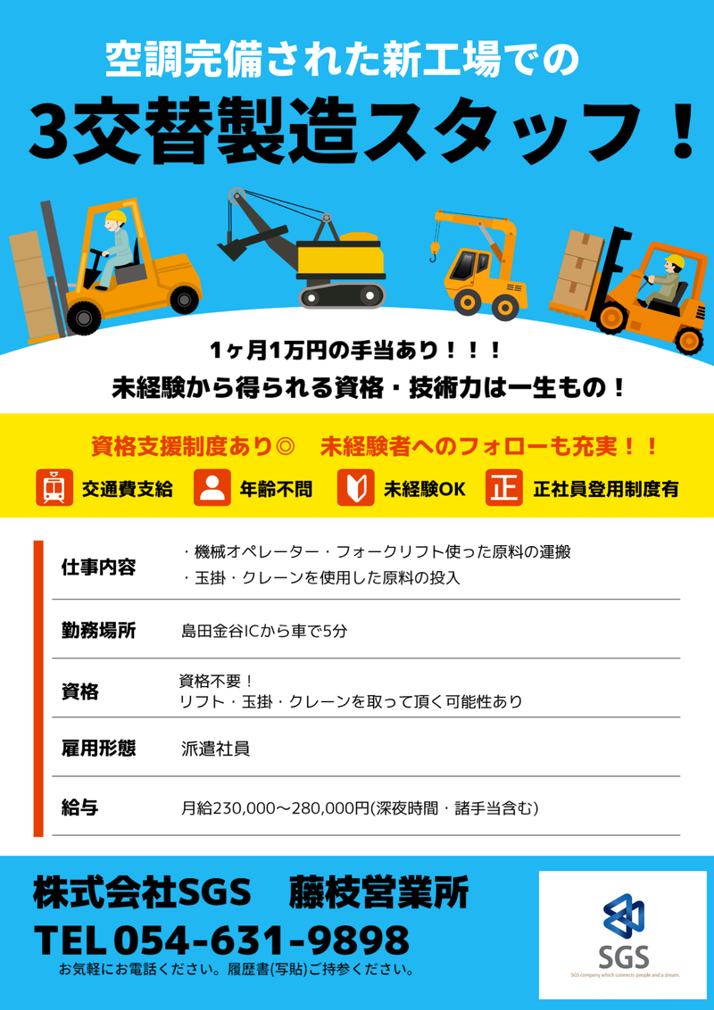 仕事内容 \アピールポイント/ ◇上場企業のグループ会社なので長期安定で働ける! ◇空調完備の屋内で夏場でも快適空間! ◇資格がなくても大丈夫! 資格支援制度充実な弊社であなたを応援☆ ◇派遣先への正社員登用のチャンスもあり ステップUP目指せます! ◇嬉しい♪給食もあり 【具体的なお仕事は・・・】 猫などのトイレに利用する紙砂の製造工場での作業 ・フォークリフトを使用したパレット、原料の運搬 ・原料を細かくするための機械へフォーリフトを使用して紙の塊をコンベアへ押し入れる 固まっている原料を手でほぐしながら投入口にゆっくり入れる コンベアが原料で埋まったらボタンを押してコンベアを稼働させる ✅コンベアが動いて粉砕機が稼働している時間は投入作業ができないので周りのお掃除や 次の原料の準備などまったりと仕事をこなしてもらいます 仕事で必要な資格は会社負担で取得できるので資格取得して、スキルアップも目指せる! フォークリフト・玉掛・クレーンの資格、実務経験がある方は即戦力になれます◎ 体を動かすのが好きな方、しっかり稼ぎたい人、資格取得してスキルアップしたい方におすすめのお仕事です★ <1日の流れ(日勤の場合)> 7:45/出社 8:00~8:10/ラジオ体操と朝礼 8:15~8:45/段取り確認 8:45~12:00/午前の作業 12:00~12:50/昼休憩 12:50~15:00/午後の作業① 15:00~15:10/10分休憩 15:10~17:00/午後の作業② 17:00~17:10/タイムカード打刻、着替え 17:15/退社 未経験の方も先輩スタッフが、進め方をサポート! わからないことがあってもすぐに聞ける雰囲気◎ 新築の工場だから空調完備で年中快適! 髪型・髪色自由・ひげOKで自分らしく働ける! 【株式会社SGSについて】 ■最大の特徴は定着率の高さ ■静岡に強い!昭和63年創業の実績と安心 ■長く培ったノウハウを生かし、求人企業様へご紹介 ■専任コーディネーターがお仕事探し~入社後のフォローアップまでバックアップ ■初めてでも安心してスタートできる簡単な軽作業のお仕事多数 ■経験が浅い方や未経験・派遣デビューの方へのご紹介も積極的に行っています ■あなたの頑張りたい気持ちを精一杯応援! ■「こんな働き方がいいな」にとことん寄り添います