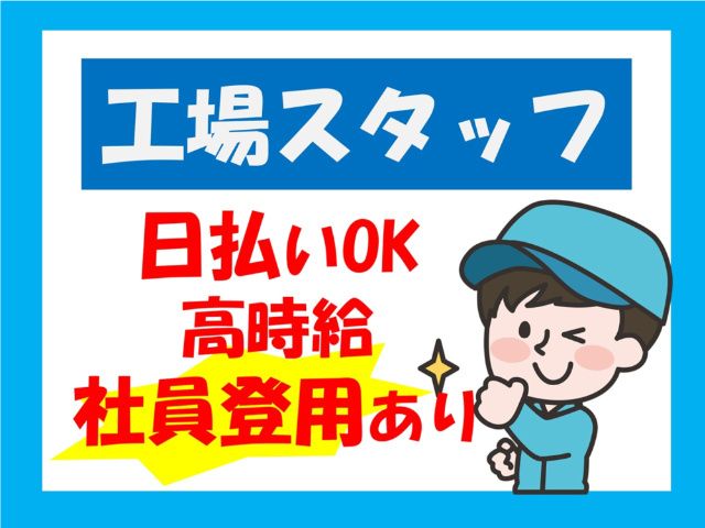 仕事内容 \製造スタッフ急募/ 派遣からスタートして正社員を目指せる! 正社員登用制度あり! 【どんなことをするの?】 派遣先の工場でラインオペレーター業務を していただきます。 ・材料セット ・起動や停止のスイッチ押し ・エラーが発生した場合の対応 ・生産設備の設定変更 など 特別な経験や資格は不要。 簡易的な作業なので 製造未経験でもできるお仕事です。 ものづくりの仕事にチャレンジしたい方、 機械いじりやDIYが好きな方、 黙々と作業するのが好きな方にオススメ。 【ここが安心】 ・職場環境や作業内容を見てから決めたい… →事前の職場見学があるので、実際に職場 を見てから決めることができます ・派遣が初めてで不安… →お悩みや困りごとがあれば、都度担当 へ相談いただけます。 派遣が初めての方もご安心下さい 【お仕事メリット】 ・稼げる交替勤務 ・高時給 ・キャンペーン時給あり ・残業少なめ(月5h程度) ・未経験スタートOK ・正社員登用制度あり ・直接雇用制度あり ・日払い、週払いOK(最短翌日振込可) 【職場環境】 *20代・30代の若年層スタッフ活躍中 *男性・女性スタッフ活躍中 *食堂あり(弁当注文OK) *ロッカー、更衣室あり *作業着貸与 *屋外喫煙所あり 【勤務地】 須賀川市 最寄駅:JR東北本線 鏡石駅より車19分 こちらのお仕事や、当社についてのご説明を随時実施しております。 https://entori.jp/human-i_koriyama#:~:text=%E5%9C%B0%E5%9B%B3%E3%82%92%E9%96%8B%E3%81%8F-,%E4%BC%81%E6%A5%AD,-%E6%83%85%E5%A0%B1 より、詳細をご確認いただけますと幸いです。