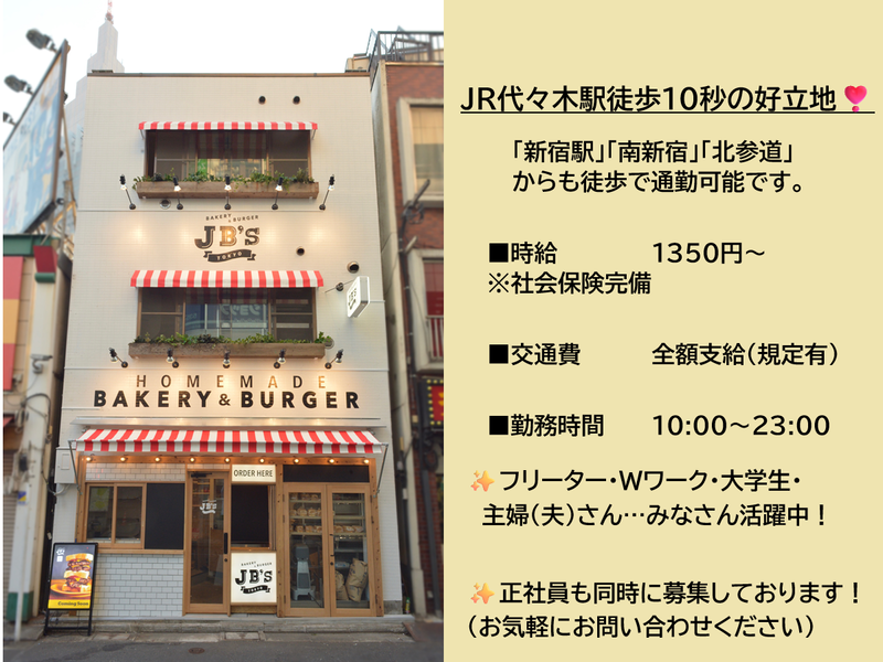 仕事内容 ******************* <当店で働くメリット多数!> ✅SNSでも話題のバズるお店 ✅髪・ネイル・ピアス自由 オシャレに働ける! ✅無料の絶品まかないあり! ✅働きやすい2週間毎のシフト制 ✅頑張りを還元!昇給は随時! ******************* ⏩2024年、2026年と食べログ100名店に選ばれたJB's TOKYO本店  ̄ ̄ ̄ ̄ ̄ ̄ ̄ ̄ ̄ ̄ ̄ ̄ ̄ ̄ ̄ ̄ ̄ ̄ ̄ ̄ ̄ ̄ ̄ ̄ ̄ ̄ ̄ ̄ ̄ ̄ ̄ ̄ ̄ ̄ お洒落なベーカリーカフェ&バーガーshop 髪色・ピアス・髭自由でオシャレに働ける! SNSでもバズリ中で友達に自慢できる! ⏩お任せするお仕事内容  ̄ ̄ ̄ ̄ ̄ ̄ ̄ ̄ ̄ ̄ ̄ ̄ ̄ ̄ ̄ ̄ ̄ 店内で焼く食パンで作る 新感覚のグルメバーガー! 楽しくお仕事できます! 主なお仕事は… ◆ ハンバーガーの調理 ◆ 店内でのパン作り(生地づくり~焼き上げ) ◆ 盛り付け ◆ レジ対応 ◆ 接客 ◆ ドリンク作り など 難しい作業はありません♪ 簡単調理や盛付、レジ業務をお任せ。 未経験でも丁寧に教えるので安心! ✨飲食に興味がある方、 ハンバーガー好き、 がっつり稼ぎたいフリーター、 本気で飲食の世界で活躍したい方、 …みんな大歓迎! ✨シフトもオシャレも自由度の高いお店で 一緒に働きましょう! ✨新店舗続々オープン予定!