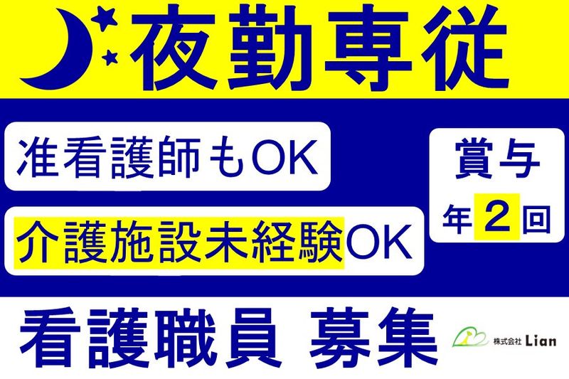 【仕事内容】 訪問介護事業所および訪問看護事業所を併設した27床の有料老人ホーム、夜勤専従看護スタッフの募集です。 介護施設未経験の方も大歓迎、ブランクある方も大歓迎です! ■詳しい仕事内容 ・ご利用者様の巡回と安否確認 ・介護看護記録、医療処置 ・起床時の介助やお手洗い誘導 など ■介護施設未経験の方も歓迎です 先輩スタッフが、一から丁寧にサポートします。ブランクのある方も、もちろん安心して働けます。 ■こんな方にオススメ ・人間関係が良い会社で働きたい ・仕事もプライベートも充実させたい ・ご利用者様と一人一人向き合いたい ・将来性のある会社で活躍したい ■有料老人ホーム リアン小牧 私たちの会社名となっているLianは、フランス語の「Lian(絆)」を由来として名づけられました。 ご利用者様との絆はもちろん、スタッフ同士も強い絆を大切にする、私たちが目指すのはそんな施設です。 いきなりのご応募が不安な方は、まずは施設見学やお問合せだけでもOKです! お気軽にご連絡くださいね。 ご応募・お電話お待ちしております。 働き方の相談や、仕事内容のご質問などのお問合せもお気軽にご連絡ください。 【求人ID-LA02】