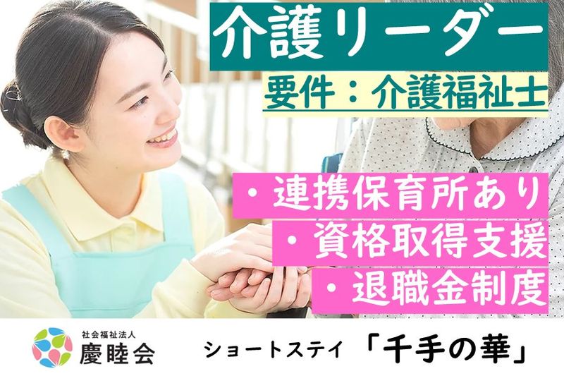 【仕事内容】 社会福祉法人慶睦会 ショートステイ千手の華にて、介護職のリーダーを募集します。 リーダー経験は問いません。本部のサポート体制や研修・教育制度も充実しています!将来、管理者や法人幹部も目指せます! ■具体的な仕事内容 ショートステイ(短期入所生活介護)における介護職のリーダー業務および入居者様の介護業務全般をお願いします。 ●早番、日勤、遅番 ・食事や入浴、排泄の介助 ・バイタルチェック ・レクリエーション など ●夜勤 ・月5回程度 ※もっと稼ぎたい!などご希望があれば夜勤回数を増やす事が可能です。 ※夜勤回数の増減はご相談に応じます。 ■仕事と子育ての支援に積極的な職場です。 ・連携する企業主導型保育所があります。 ・お子さんの急な病気、学校行事のお休みにも対応いたします。 ・子育て中のための制度が多くあります。 いきなりのご応募は不安という方も是非施設見学だけでも歓迎です。 ご質問などもお気軽にお問い合わせください。 ご連絡・ご応募お待ちしております ★Instagramでも発信をしています!『 慶睦会 インスタグラム 』で検索してみてください!