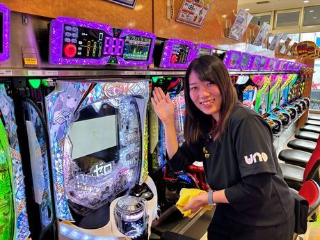 職場環境 【従業員構成】 ☆実際に働いてる方にインタビュー☆ ●Oさん(主婦/20代/女性) 元々パチスロが好きでこの仕事を探していました。 その中でネイル・髪色が自由で近かった 朝霞UNOに応募しました! 働き始めてまだ1ヶ月ですが、 みんな優しくて素敵な雰囲気です! 早番で好きな時間に働けるのも魅力的! 幅広い年齢層なのでいろんな人と関われるのも 良いポイントです! ●Kさん(フリーター/20代/女性) パチンコ・スロットは何一つ分からないですが 通うのに近く、時給が高かったので応募しました! 未経験で不安もたくさんでしたが、 未知の世界に足を踏み込んでみて、 意外と面白いんだなぁと感じています。 朝霞UNOの特に良いところは、 インカムで話したときに明るく返事してくれるところです! 初めての方は、未経験で不安かもしれませんが、 ひとまず挨拶ができればOK! 家が近いから、ネイルが出来るから、 など応募動機は何でもOK! まずは応募してみてください♪ 【職場の雰囲気】 にぎやかな職場 協調性がある 立ち仕事 アットホーム お客様との対話は多い 初心者活躍中 力仕事が少ない 自分の都合に合わせやすい 知識、経験不要