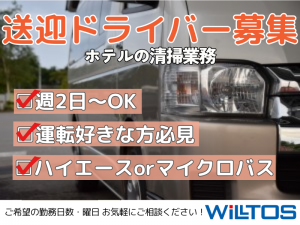 インフォメーション 【運転好きな方必見!】得意を活かして楽しくお仕事しませんか? ☆週2~4日勤務いただける方大募集!もちろん勤務日数はご相談ください! ☆未経験者活躍中 ☆シニア・主婦(夫)さん活躍中 ☆扶養内勤務可 ☆チームでのお仕事 ☆通勤手当支給(当社規定による) ☆社会保険完備 ☆受動喫煙防止措置あり ~~~~~~~~~~~~~~~~~~ お電話でのご応募も受け付けています!お気軽に、まずはお電話ください♪ 応募受付TEL 0120-160-086 ~~~~~~~~~~~~~~~~~~ アピールポイント ☆運転が好きな方必見 好きなことをして稼いでみませんか? ☆未経験者活躍中 未経験から始めたスタッフが90%以上! 研修も充実しているので安心して始めていただけます☆ ☆シニア・主婦さん活躍中 幅広い年齢層の方が活躍しています! ☆扶養内勤務可 ☆チームでのお仕事です 仕事自体は一人の時間が多いですが チームで分担して行っており リーダーや担当社員もいるので 安心して働けます。 ☆社会保険完備 労災保険に入れるので万が一のことがあっても安心! 雇用保険、社会保険ともに週3日以上の勤務で適用になります。 ☆通勤手当支給 社内規定によりますが、 公共交通機関利用で月最大10,000円 自家用車使用で月最大3,000円支給いたします! ☆受動喫煙防止措置あり 請負のお仕事なので勤務地での喫煙は禁止です。 当社は昨年40周年を迎え、パートナー社員の方を中心に約950名の方が働いています。 パートナー社員の方々に支えられ当社もここまでこれました。 これからもたくさんのパートナー社員の方々と共に、お客様の利用される空間をより清潔で快適な環境を提供し続けていきたいと思っております。 皆様も是非ウィルトスで一緒に働きませんか?