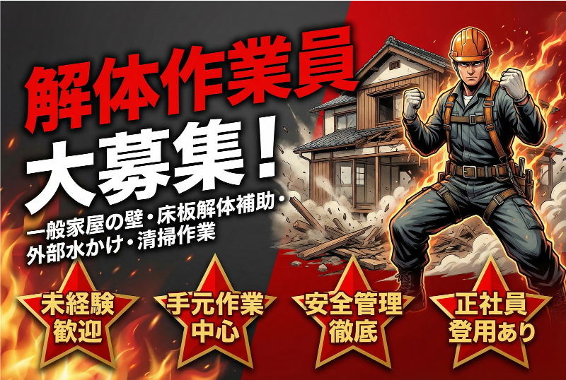 仕事内容: 一般家屋の解体作業をお願いします! 具体的には、 ・家屋内の壁や床板の解体 ・解体した廃棄物の仕分け ・外部解体での水かけ作業 ・清掃 etc 基本的には手元や軽作業中心のお仕事なので安心して勤務できます!