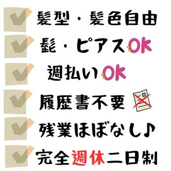 【保険制度】 雇用保険、労災保険、健康保険、厚生年金 待遇・福利厚生 【福利厚生】 ・週払い制度あり ・休憩室に冷蔵庫、電子レンジ完備 ・鍵付き個人ロッカーあり