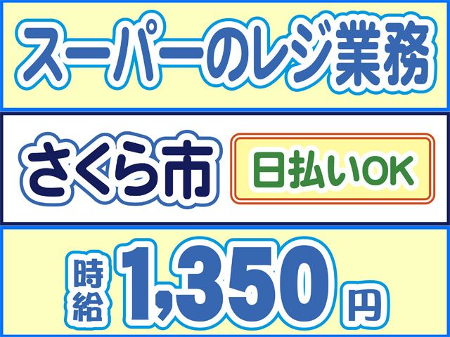 仕事内容 未経験でも始められます 2026年1月オープン予定 【レジスタッフのポイント】 〇未経験OK 〇接客経験も活かせる 〇時給1,350円スタート 〇週4日~OK 〇勤務時間選べます! 〇働きやすい環境、 新店舗で空調完備・制服貸与 〇日払いOK(規定内) 〇職場見学OK 〇履歴書不要 〇「マイリク定着支援」導入企業 【レジスタッフの仕事内容】 さくら市での大手スーパーでのお仕事です。 人気のオープニングスタッフの募集です。 店舗内での作業なので空調完備で快適! 未経験者から始めた方がほとんどです。 セミセルフレジなので、 お釣りの受け渡しなどはありません! 新店の為みんなと一緒にスタートできますよ。 職場見学(30分~1時間程度)を実施しております。 実際に作業内容を見てから決めていただけます! 【勤務について】 〇勤務時間が下記から選べます (1)9:00~18:00(実働8時間) (2)13:00~22:00(実働8時間) 〇シフト制(週休2日制) ※週4日~相談OK 急な発熱・体調不良・冠婚葬祭など、 突発的なお休みに柔軟に対応しております。 【経験活かせます】 〇店舗スタッフ(業種不問)パート・アルバイト 〇営業・販売員パート・アルバイト ブランクある方もOKです 人と関わるのがお好きな方、 営業・販売などの経験を活かして働けます ご不明な点はお気軽にお問い合わせください。 お電話でのご応募も受付中 株式会社ロフティー 小山支店 TEL0800-222-6888(フリーダイヤル) 採用担当まで お仕事情報などはこちら https://entori.jp/lofty-oyama コーディネーター・定着支援のWサポート体制導入 「マイリク定着支援」導入企業! アンケートで職場の様子を確認し、 コーディネーター・定着支援担当が連携してサポート。 はじめての派遣でも安心して働けるよう迅速かつ 丁寧にサポート対応いたします。