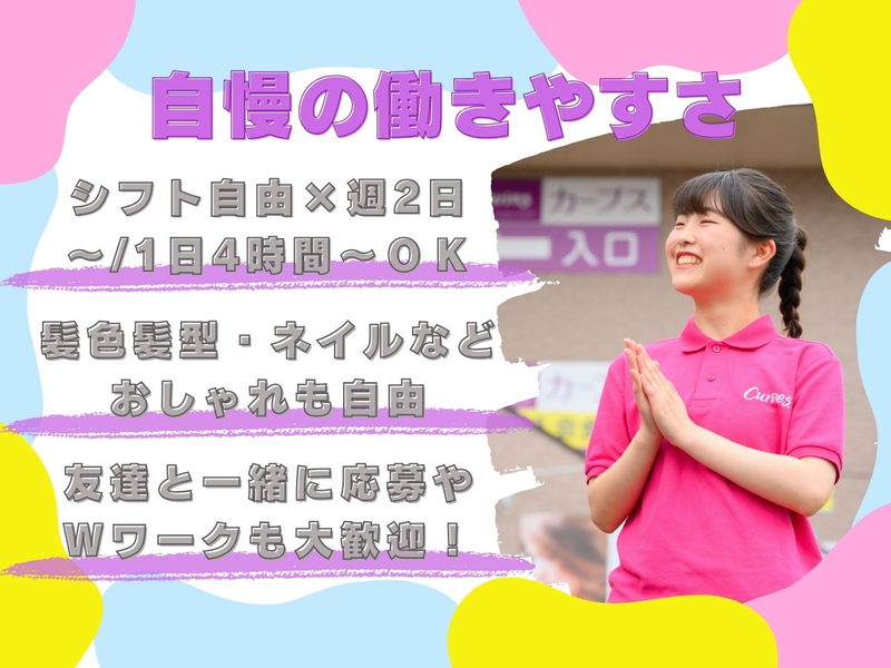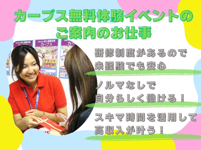 仕事内容 \1か月だけの短期ワーク/ 気軽に始められる期間限定のお仕事です! ▼==================▼ 健康と美容に関心を持つ女性の 「やってみようかな」 という気持ちを後押しする、 店舗での無料体験イベントの ご案内をお任せします。 ▲==================▲ ✅時給1,400円&週3日~・1日4h~OK ✅予約1件ごとに100円支給 ✅フリーター・Wワーク・学生さん の方歓迎! ✅ノルマなし!強引な案内はありません! ✅未経験から始めやすいお仕事です 女性専用フィットネスクラブ「カーブス」を 地域の方に知っていただくためのお仕事です。 店舗前や近隣エリアで、イベントの告知や チラシ配布、無料体験会のご案内を行います。 業務前には研修があり、サポート体制も整っているため、 専門知識や経験は必要ありません。 無理な勧誘や目標ノルマは一切なし。 人と話すことが好きな方に向いています。 勤務は1ヶ月の短期募集。 (状況により延長の場合あり) 春休み期間中に働きたい方や、 新学期に向けて今のうちに資金を準備したい方にも始めやすい期間限定ワークです。 「まずは短期間で挑戦してみたい」 という方にも無理なくスタートできます。 平日のみ勤務も相談可能で、 午前だけ・午後だけなど、 生活リズムに合わせて調整しやすいシフト制。 家事や育児の合間、Wワークのすき間時間にも組み込みやすい働き方が可能です。 ▶仕事の流れ まずは店舗へ出勤し、チラシなど必要な備品を準備。 多くの方へお声がけしながら、 イベントの雰囲気づくりを行います。 ⭐女性の一歩を応援 カーブスには、 「きれいになりたい」「体を引き締めたい」 と通われる若い世代の女性だけでなく、 運動不足の解消や健康維持を目的とした 中高年の女性会員様も多く在籍しています。 今回のお仕事は、 「気になっているけれど内容が分からない」 そんな方に寄り添いながら、 カーブスの魅力を伝える存在です。 あなたのご案内をきっかけに、 より健康的で前向きな毎日を スタートされる方が増えていく―― その実感が、この仕事のやりがいにつながります。