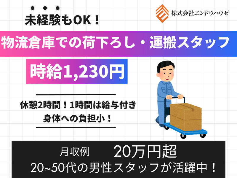 仕事内容 ★アピールポイント★ ・日勤固定・週休2日で生活リズム安定 ・ 重すぎない荷物で身体への負担少なめ ・ 休憩たっぷり2時間&1時間は給与付き ・ 20代~50代の男性スタッフ活躍中 ・ 未経験スタートでも定着率◎の職場 ★お仕事の内容★ ホームセンター向け商品の物流倉庫で、荷下ろし・運搬作業をお任せします。 <具体的には> ・トラックコンテナから荷物を降ろす作業 ・台車を使用して倉庫内へ運搬 取扱商品は日用品・資材・家庭用品など様々。軽い物から中程度の重量物までありますが、基本的に一人で持てるサイズです。 \未経験スタート多数!/ コツコツ進められる単純作業が中心なので、体を動かす仕事が好きな方に最適です。 なんと今だけ!2026年2月末までの入社で入社祝い金5万円支給✨ <支給条件> ※2026年2月末までに入社の方 ※初回2ヶ月の契約期間の出勤率90%以上で5万円支給