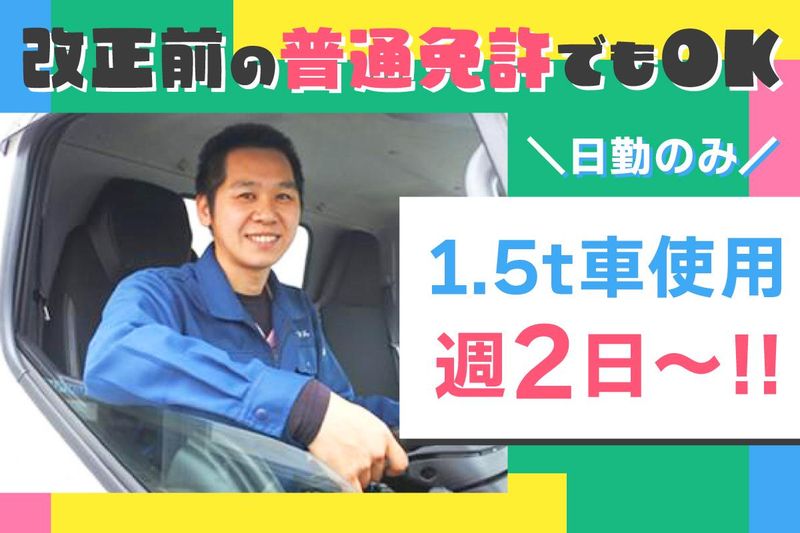 仕事内容 ⭐この春、新しい自分でスタート⭐ ✨土日は時給アップ! ✨改正前の普通免許でOK ✨週2日~勤務可能 【仕事内容】 1.5tトラックを使用して、 クリーニング品の ルート配送をお願いします。 ✅配送業務 ✅クリーニング品の回収・納品 ✅工場での作業全般をお手伝い 担当エリアや配送店舗は固定で、 配送するものは軽量物なので安心!