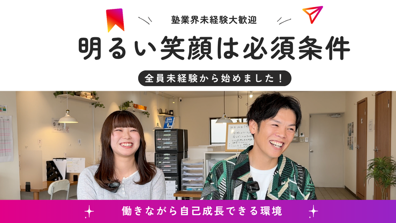 仕事内容 ✨想定年収400万〜800万円!頑張りを即給与へ ✨残業月8h&日月祝休みで私生活も充実 ✨ビラ配り・テレアポ等の営業活動なし \「夜まで働く」リズムはそのままに、キャリアを上げる/ アパレルや飲食店で、夜遅くまで 立ち仕事をしてきたあなたへ。 その「人の懐に入る力」は、子供たちの やる気を引き出す最強のスキルです。 授業はプロの講師が担当。 あなたは「教室の顔」として 生徒を笑顔にするのが仕事です。 【✨具体的な業務内容】 ✅生徒のモチベーション管理(声掛け) ✅保護者対応・面談・LINE連絡(成果の共有) ✅教室の運営管理・講師の管理 ✅教室の開閉校・出欠管理 22時までの勤務は、接客業の あなたなら慣れているはず。 でも、これからは「立ちっぱなし」も 「理不尽なクレーム」もありません。 接客で身につけたあなたの 対人スキルをここで活かしませんか? 【✨1日のスケジュール】 13:15 出社・清掃・事務作業 14:00 休憩(リフレッシュタイム) 15:00 講師との打ち合わせ・授業準備 16:00 生徒が来塾!笑顔で出迎え、日報を確認 21:30 生徒の見送り・終礼 22:00 退社(サービス残業は一切禁止しています) 【✨「頑張り」がすぐ給与に直結する仕組み】 弊社では、年1回の定期昇給を待つ 必要はありません。 ✅毎月のスピード昇給あり 個人の能力や成長を毎月評価。 「できること」が増えれば、 翌月の給与から即反映も可能です。 チャンスは年に12回あります。 ✅納得感のある評価テーブル 「9等級×5段階」の明確な基準を用意。 売上だけでなく、顧客からの感謝の声や 日々の行動など、約15項目を数値化して 公平にあなたの頑張りを評価します。 【✨保護者様からの感動の声】 ✅「塾に行きたくない!」と言っていた息子が 先生のインスタを見て「ここなら行きたい」と 自ら言い出しました。今では楽しんで通っています。 ✅睡眠やメディア時間のアドバイスまで してくれる。ここまで塾がやってくれるんだ! と親子で驚いています。 【✨入社者インタビュー】 [入社1年目/23歳/元教育学部生] 教員免許を取りましたが、社長の 「まず自分が成長する」という言葉に 惹かれて入社。失敗を責めず、 次の行動を評価してくれる環境なので 毎日ワクワクしながら働けています。 【KURAICHIとは】 岡山県で「毎日個別指導塾SUNDAY」を4店舗運営している会社です。 現在は以下の4店舗体制となっており、いずれか通勤しやすい場所に勤務いただく想定です。 ※不明点や配属先のご希望については、面談内で詳しくご説明させていただきます。 1. 倉敷沖校 岡山県倉敷市沖276-14 野口ビル 1F北 2. 問屋町校 岡山県岡山市北区田中103-105 エバンスワケ・2 3. 庭瀬校 岡山県岡山市北区東花尻314-7 タイショウ7ビル 4. 茶屋町校 岡山県倉敷市茶屋町1595-4 全校舎、バイク通勤OK、車通勤(要相談)です。 あなたのライフスタイルに合わせて、無理なく働ける環境を相談して決めていきましょう。