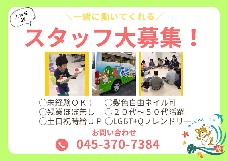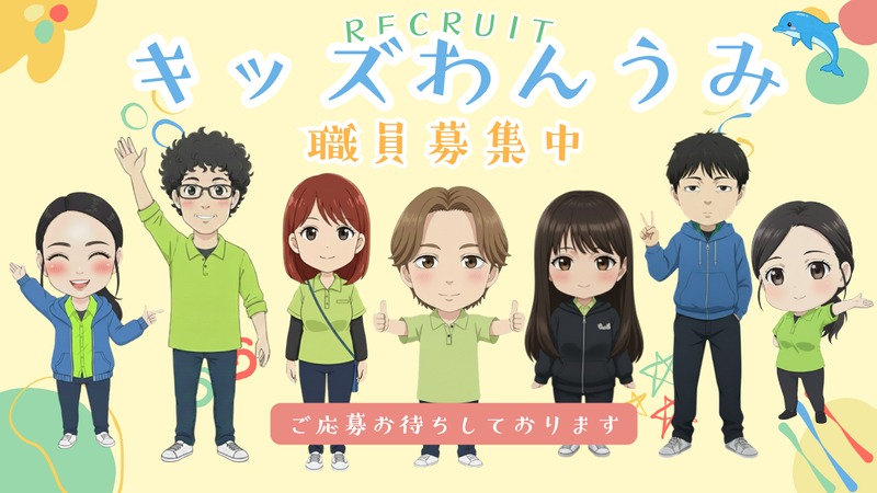 職場環境 【キッズわん うみ構成】 児童発達支援管理責任者:1名 保育士:1名 児童指導員:4名 強度行動障害支援者(実践):4名 指導員:2名 喫煙所:なし(敷地内全て禁煙)