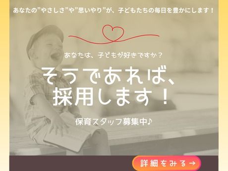仕事内容 【仕事内容】 \今すぐ入職もOK◎4月スタートも大歓迎♪/ 穏やかな時間が流れる園で、保育もオシャレも楽しもう◎ 少人数ならではの丁寧な保育ができる環境で、あなたらしい働き方を応援します♪ ***************************** ◎主な仕事内容◎ ・保育補助(おむつ替え・ミルク、食事、排泄・着替えなど) ・お散歩の付き添い ・給食、おやつ後の片付け清掃 ・担任のサポート など *安心ポイント* ・ブランクがある方も丁寧にサポートします♪ ・経験が浅くても先輩保育士がしっかりフォローします♪ ・残業なし&持ち帰り仕事ゼロを徹底♪ 自社のHPもぜひご覧ください! コツヨシKids https://kotuyosi-kids.com/ 【アピールポイント】 ◎家庭と両立しやすい働き方ができます◎ ・残業はありません&持ち帰りの仕事もなし♪ ・決まった時間でお仕事が終わるので、退勤後からはご家庭の時間に。無理なく続けられる環境です♪ ◎久しぶりのお仕事復帰でも大丈夫◎ ・子育てがひと段落した方や、保育の現場から離れていた方も多数活躍中♪丁寧なサポート体制が整っています◎ ◎人間関係の良さが働きやすさにつながっています◎ ・「困ったときはお互いさま」の気持ちで、声をかけ合えるあたたかな雰囲気です♪ ◎有休取得率100%&柔軟なシフト相談OK◎ ・お子さまの急な体調不良や学校行事など、ライフスタイルに合わせて柔軟に対応しています♪ ・シフトの相談もしやすく、お休み希望も通りやすい環境♪お子さんの急なお熱や学校行事なども柔軟に対応しています◎ TikTokにて各園の雰囲気が覗けます♪ @kty_kidsにてチェック♪