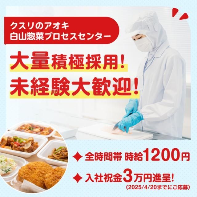 仕事情報 ● 仕事内容 クスリのアオキに並ぶ、美味しいお弁当やお惣菜。 その裏側には、あなたの力が必要なんです! キレイな新工場で、揚げ物、焼き物、蒸し物などの調理や加工をお任せします。 難しい作業はありません!チームで協力しながら、翌日の仕込み作業や簡単な調理がメインなので、未経験の方も安心して始められます。 こんな方にオススメ 午前中に集中して働けるシフトです。午後は家事や趣味、Wワークなど自由に活用できます!子育てと両立したい主婦(夫)さんや、午後は別の仕事がある方にもピッタリです!接客なしで人の目を気にすることなくモクモクと働いていただけます! 未経験者もOK 工場で初めて働く方も安心!入社後はビデオ視聴などの安全に働いていただくための座学研修が御座います! また、働き始めてからも複数名で同じ作業を行いますので、久しぶり・初めてのお仕事でも安心です! OJT研修もしっかり実施致しますのでお気軽にご応募ください! 幅広い世代の方々を募集 高時給でしっかり稼ぎたい高校生から、家事や育児と両立したい主婦(夫)の方、セカンドキャリアを充実させたいシニア世代まで、一人ひとりのライフスタイルに合わせて働ける職場です。あなたの「やってみたい!」を応援します。 会社情報 「健康と美と衛生」を通しての社会貢献が経営理念であるクスリのアオキは、北信越・東海・関西・関東・東北に展開しています。地域の健康を守る「かかりつけ薬局」としてドラッグストア内に調剤薬局を併設した店舗など、お客様の求めるサービスを追求しています。