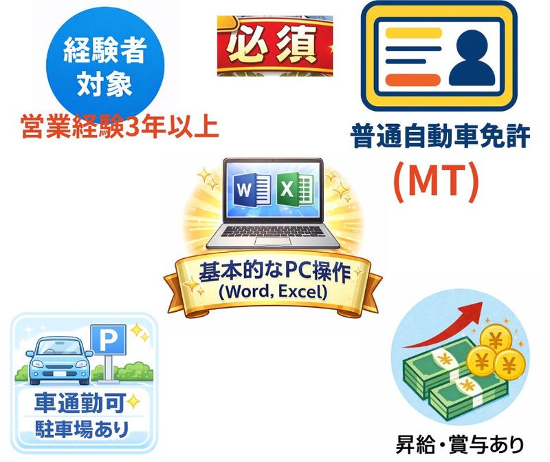 資格 【必須】 ■高卒以上 ■営業経験3年以上 ■基本的なPC操作(Word、Excel) ■自動車免許をお持ちの方(AT限定不可) ※MT 【歓迎】 ・ 宅地建物取引士(旧:宅地建物取引主任者) 既卒・第二新卒歓迎 ブランクOK