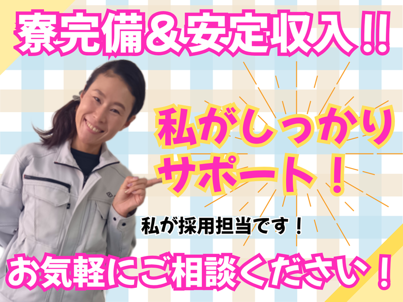 【保険制度】 雇用保険、労災保険、健康保険、厚生年金 待遇・福利厚生 【福利厚生】 ・社会保険完備 ・定年60歳 ・再雇用制度有(65歳) ・寮完備(1R寮…月2~3万円/規定有) ・制服貸与 ・食事補助 ・永年勤続表彰制度 ・退職金制度(規定) ・慶弔見舞金制度 ・定期健康診断(年1回~2回実施) 【充実した福利厚生・快適な環境で働けます!】 ◎寮について ・即入居可能 ・オートロック完備で安心・安全 ・寮費:月2~3万円 ・Wi-Fi無料 ・宅配ボックスあり ・職場まで徒歩5分 ・通勤ラクラク&隣にコンビニあり ・エアコン付き ◎職場の環境 ・夏にはポカリスエットなどの支給もあり ◎作業用品の支給充実! ・作業服 ・ヘルメット ・作業靴 ・カッパ ・長靴 ・防寒具など ≪入寮希望の方は…≫ ⭐自転車貸出無料!