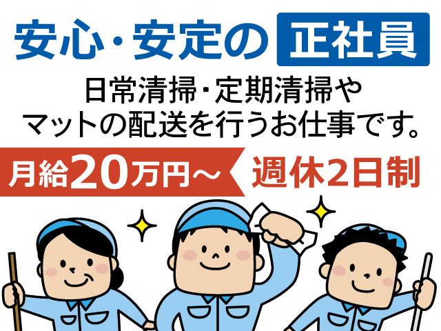 仕事内容 年齢・経験不問の正社員募集! 60歳以上の社員多数活躍中! ////////////////おすすめポイント//////////////// 〇普通免許をお持ちならご応募可! 〇安定の正社員募集!! 〇週休2日制(シフト制、応相談) 〇働きやすい日勤の時間帯 〇フリーター・主婦さんも活躍中 〇年齢不問で幅広い年代活躍中 〇中高年・シニアの皆様の転職を応援 〇長く勤めたい若い世代の方にも! 〇清掃業未経験歓迎! ////////////////////////////////////////////////////// <お仕事内容> 魚津市内や黒部市など、 新川地域近隣にて 正社員として日常清掃・定期清掃 (ワックス・ガラス清掃など)や マットの配送を行うお仕事です。 重量物などの持ち運びなどはなく、 体力的に厳しいものはありません。 新川地域近隣の有名ホテル様、 健康増進施設様、お取引企業様での 定期清掃がメインのお仕事です。 滑川市/入善町/朝日町からも通勤しやすい <こんな経験も活かせます> ・清掃員のパート・アルバイト ・配送、配達、ドライバーの経験 ・普通免許(AT限定可) ハローワークやシルバー人材センターなどで 良い仕事が見つからないという方、 ご質問がある方も お気軽にお問い合わせください。 あなたからのご応募をお待ちしています。 【応募について】 お電話でのご応募も承っております。 TEL.0765-24-5406(採用担当まで) 受付時間/平日9:00~18:00