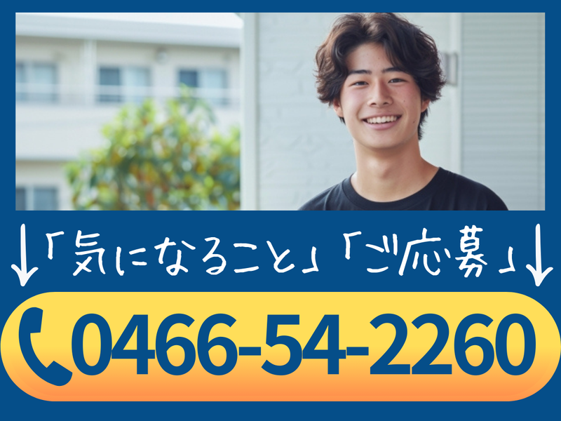 選考プロセス WEB応募または電話応募 *WEB応募:応募画面に進む より *電話応募:0466-54-2260 ▼ 応募確認後、当社から 1~3日以内にメッセージや お電話にてご連絡します ▼ 面接の日程を決めます ▼ 面接1回(履歴書持参) ▼ 採用! 面接後1~7日以内にご連絡します 在職中の方は入社日など応相談! 2026年1~3月の勤務開始も可能✨ 【 面接について 】  ̄ ̄ ̄ ̄ ̄ ̄ ̄ ̄ ̄ なるべくたくさんの人とお会いしたいと 考えています。いつものあなたの服装で 見学のつもりで是非いらしてください!