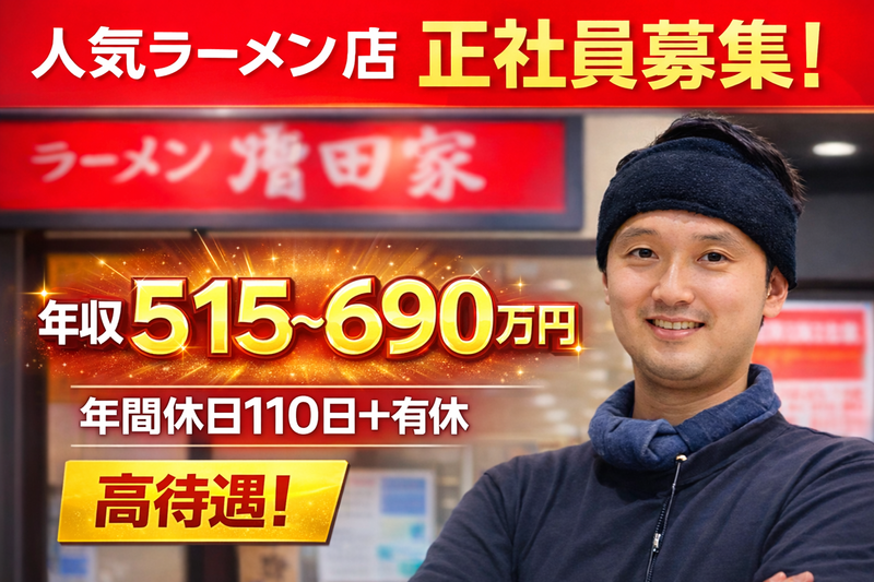 仕事内容 \【人気ラーメン店】「ラーメンたかし屋」のキッチン・ホール業務/ ✅ホール業務 └お客様のご案内、オーダー └配膳、会計...etc ✅調理業務 └食材の発注、仕込み └ラーメンや各種メニューの調理 └洗い物...etc ラーメンづくりや接客の技術をしっかり身につけたのち、 店舗で麺やスープの仕込みを極めていくもよし。 チーフ、店長、SVへとステップアップするもよし。 あなたの希望に沿った形でキャリアを歩んでいただけます。 【アピールポイント4点!】 1. 生活水準が即上がる!手厚すぎる「固定給+手当」 ✨月給固定32.5万円~ ✨住宅手当(月5万円)を全員に一律支給! ✨賞与は年4回(固定2回+業績連動2回) 安定した生活基盤の上で、成果に応じたボーナスもしっかり狙えます。 2. 「飲食=ブラック」の常識を覆す働きやすさ 「休みが取れない」「毎日長時間残業」…そんな悩みとは無縁です。 ✨年間休日110日(月8~10日休み) ✨月平均残業20時間以内 ✨1店舗に社員2~4名配置 人員に余裕があるため、正社員であっても休日出勤することなく、しっかりリフレッシュできます。 3. 「何をやれば昇格できるか」が100%明確 「上司に気に入られたら昇格」のような曖昧さはゼロ。 売上・利益・育成など、単純明快な評価基準をクリアすれば、年齢・社歴関係なく誰でもキャリアアップできます。 4. 【実例】中途入社3年目で店長へ! 飲食店でのアルバイト経験や若さを武器に、短期間で店長へキャリアアップした若手社員が在籍中です。 店長の年収は620~700万円! ✅株式会社マスミフードサービスとは? 「大衆酒場 ちばチャン」や「増田家」など、1都3県に38店舗を展開する飲食企業です。 年商約70億円の安定した経営基盤を強みに、居酒屋からラーメン店まで幅広く運営。 地域密着の多角経営だからこそ、高水準の給与と業界トップクラスのホワイトな働き方を実現しています。