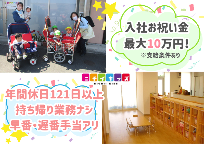【Point オススメポイント】 ◇◆ニチイキッズあみ保育室~0‐2歳児までの定員19名のアットホームな小規模保育園◇◆ 園児さんだけでなくスタッフの笑い声や笑顔溢れる元気いっぱいな保育園!! 20~50代の幅広い年代の方が活躍!! *子育てママさんも勤務しており理解のある環境です。 OJTトレーナーがしっかりあなたをサポート!! 不安が無いように進めていくのでご安心ください!! 相談しやすい環境でのびのびと働くことができます。 問題が起きたら一人で背負わずみんなで考える環境、相手を尊重し合い、 得意な事が伸び伸び発揮できるのが魅力です!! 困ったことは皆で解決するので、 持ち帰りの業務や残業はほとんどありません。 長く安心して勤務ができるよう様々な休暇制度、福利厚生をご用意しておりますので、 充実したメリハリのある生活が送れますよ♪ 【仕事持ち帰りゼロへの取り組み】 園全体で協力して仕事持ち帰りゼロを目指しています。 ひとりで抱えることなく話し合いながら進めます。 いつもスタッフで話し合ったり、声をかけ合ったり、協力し合える環境を作ることで、 持ち帰り仕事ゼロ・残業時間の削減を目指し取り組んでいます。 【入社お祝い金について】 以下の条件を満たす方を対象に、最大10万円の入社お祝い金を支給! ①保育士経験が2年以下の方:5万円 ②保育士経験が2年以上の方:10万円 ※その他支給にあたり当社規定あり 【Message 採用担当者より】 ニチイキッズあみ保育室では、 子どもたち一人ひとりとしっかり寄り添い関わり合いながら、 スタッフみんなで楽しく保育をしております。 持ち帰り業務無し!年間休日121日以上でプライベートも充実♪ 先輩・後輩問わず相談・悩み事相談も♪ 休憩時間には雑談も気軽にできるところが魅力の園です。 みんな得意・不得意がある中で、みんなで協力・補い合いながら業務が出来、 フォロー体制もしっかりしていますので、のびのびと保育を楽しんでください♪ また、OJTトレーナーがとなりでしっかりあなたをサポートで 不安が無いように進めていくのでご安心ください!! 毎日笑顔で明るく子どもたちと関わってくれる方、 ご応募お待ちしております。 まずはぜひ、保育園に来てみてください!スタッフ一同お待ちしております。 <採用担当> ニチイ学館 関東第三支部 人材課 TEL:048-644-6474(平日9:00~17:15)
