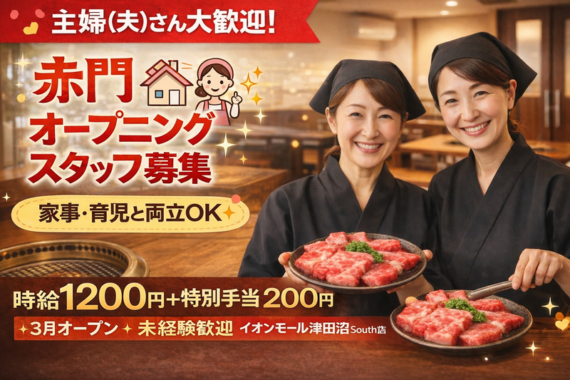 仕事内容 ✨『 主婦(夫)さん歓迎 』家事両立応援 ✨ ___________________ 千葉県内で展開する焼肉チェーン赤門の 新店舗が「津田沼」に登場!! ⚡ フルタイムで働きたい! ⚡ 家事の前に働きたい! ⚡ 店舗の立ち上げに関わりたい! 働きやすいシフトで、 家庭・家事と両立可能なお仕事です! ━━━━━━━━━━━━━━━━━━━ ✨津田沼店限定『 家計に嬉しい 』社割✨ ___________________ 株式会社赤門で働く際の食事補助に加え 「津田沼店限定」で従業員優待アリ! ⚡ イオンモール津田沼South内で 使える従業員優待も使えます! 今回の募集は"平日限定募集"! お得に稼げるお仕事、始めてみませんか? ━━━━━━━━━━━━━━━━━━━ \✨ オープニングメンバーでの活躍 ✨/ ➢学生時代・過去に飲食未経験でもOK! お仕事の流れは丁寧にお教えしますので ブランクのある方でも安心スタート! ➢今だけ限定で、オープニング準備の流れ に関わることができるチャンス! ➢まずはパートとして働きながら 「育児が落ち着いたら」 「仕事に慣れてきたら」 あなたのタイミングで正社員登用もOK! ⏩ +今なら「オープニング手当」あり! 時給に+200円=高時給1400円~で 『 お得に&賢く 』稼げます! ━━━━━━━━━━━━━━━━━━━ 【仕事内容】 焼肉店 赤門にて下記のお仕事をお任せ! <ホール> ◎接客 ◎配膳 ◎レジ <キッチン> ◎洗い物 ◎簡単な調理補助 ※お肉のカット・盛付など 簡単な業務ばかりなので未経験でも安心♪ ※オープンまでは既存店舗にて研修します。 ━━━━━━━━━━━━━━━━━━━ まだまだ伝えきれない❗ 株式会社赤門で働くメリットをご紹介❗ ___________________ ➰全品半額になる食事補助あり➰ ❏ 絶品焼肉がお得に食べられる! ❏ 焼肉が大好きな方は大歓迎! ___________________ ⏰働きやすさも魅力の1つ⏰ ❏ 家庭・Wワーク・育児と両立ラクラク ❏ 柔軟なシフト対応が可能です! ❏ バイト→社員として働くスタッフ多数 私生活の予定に合わせて働きたい日を 提出できるので無理なく続けられる! ___________________ 💡家事・育児と両立できる秘密💡 ❏ 扶養内勤務もOK! ❏ お子様の急な発熱でのお休みもOK! ❏ 学校行事への参加でのお休みも相談可 「子どもが学校に行っている間に」 「家事の前に・買い物の前に」 時間を有効活用して働く主婦(夫)さんも◎ ==*==*==*==*==*==*==*==