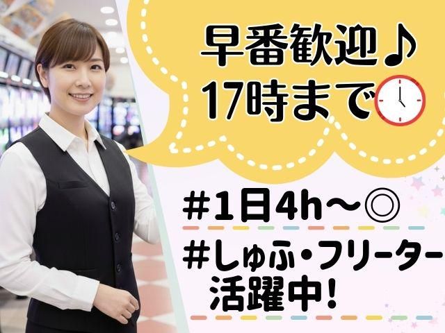 仕事内容 ✨大人気!早番スタッフ大募集✨ こんな方にピッタリ! ✅ 昼間に働きたいフリーターさん ✅ 夕方には帰りたい主婦(夫)さん ✅ 朝型生活で健康的に働きたい方 「朝だけサクッと」 「子どもの送迎時間まで」 など、短時間のシフトもOKです♪ ★髪色・ネイルも楽しめる♪ ★1日4h~勤務OK! ★研修期間も時給そのまま ★未経験スタートのスタッフ活躍中✨ ⌒⌒⌒⌒⌒⌒⌒⌒⌒⌒⌒ パチンコ店での接客をお任せします。 ◎お仕事例  ̄V ̄ ̄ ̄ ●店内の巡回 ●お客様のお出迎え・ご案内 ●遊技台のカンタンな清掃 ●カウンターでの賞品交換 など ✅未経験スタート大歓迎☆彡 とっても手厚い研修制度が整っているから、 誰でも気軽にスタートできちゃいます♪ 実は、先輩スタッフの8割が未経験からのスタート!✨ 「面接に来るまでお店に入ったこともなかった」 という先輩も中には多数いるんです…! バイトデビューや、ブランクのある方も大歓迎です。 もちろん経験者さんも◎即戦力として働けますよ♪ ⌒⌒⌒⌒⌒⌒⌒⌒⌒⌒⌒ \おすすめPOINT/ ⭐力仕事なし 最新設備を導入しているから重た~い玉運びはありません! 年齢・性別問わず誰でも活躍できる環境です(*´﹀`*) ⭐髪色・ネイル相談可(規定あり) オシャレを楽しみながら働ける♪スタッフに好評です◎ 詳細については、お気軽にお問い合わせください。 ⭐1日4h~OK 柔軟シフトだからプライベートも充実! フリーターさんや、主フさんを中心に 様々なライフスタイルのスタッフが活躍中✨ 希望の働き方があればお気軽にご相談ください(*'∇')b ⭐研修中も時給変動ナシ 研修期間中も時給変わらず働ける♪ 初日からしっかり稼ぎたい人にオススメです✨