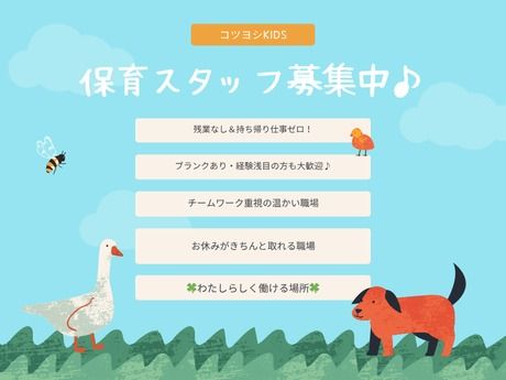 仕事内容 【仕事内容】 \【今すぐでも、来年4月からでもOK♪】/ ブランク・未経験でも安心スタート♪ 夜勤なし・残業なしで、家庭との両立もバッチリ◎ *************************** ★主な仕事内容☆彡 ・園児、職員の健康管理 ・発熱・ケガ時の対応、保護者への連絡 ・保育補助(おむつ替え・ミルク、食事、排泄・着替えなどの生活援助) ・園内の保健衛生管理(おもちゃの消毒など) など *安全ポイント* ・ブランクがある方も丁寧にサポートします♪ ・経験が浅くても先輩保育士がしっかりフォローします♪ ・残業なし&持ち帰り仕事ゼロを徹底♪ ・おしゃれ(髪色・ネイル※会社規定有)OK♪自分らしく働けます◎ あなたの”やってみたい”という気持ちを、チームみんなで支えます。 まずは子どもたちと一緒に笑顔で過ごすところから、始めましょう♪ 自社のHPもぜひご覧ください! コツヨシKids https://kotuyosi-kids.com/ 【アピールポイント】 ◎日勤のみ♪残業なし&持ち帰り仕事ゼロ◎ 夜勤や急患対応はありません。規則正しいリズムで働けます♪ 家族との時間も大切にしたい方にピッタリです♪ ◎医療行為なし♪穏やかに働ける環境◎ 点滴・注射などの医療行為はありません。ブランク明けの方、保育未経験の方も、少しずつ慣れていけます♪ ◎チームワーク重視の温かい職場◎ 保育士さんと連携しながらチームで子どもを見守ります◎ ◎働きやすさが定着率の理由◎ 有休取得率100%しっかり休んで、しっかり働くを実現しています◎ 「子どもが大好き!」その気持ちがあれば大歓迎です♪ TikTokにて各園の雰囲気が覗けます♪ @kty_kidsにてチェック♪