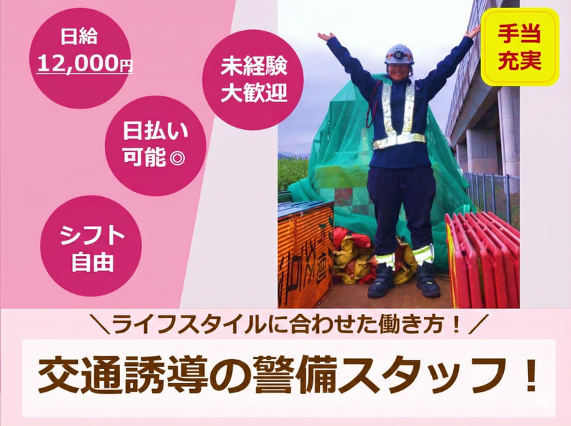 仕事内容 |日給12,000円~◎ |寮社宅完備 |シフト自由 |臨時ボーナスあり |日払い可(1勤務1万円の払い出し) |直行直帰あり |資格取得支援制度あり |社員登用あり ─…─…─…─…─…─…─…─…─ 【仕事内容】 主にイベント会場や工事現場における交通誘導警備をお任せします。 《具体的には…》 ・歩行者の安全確保 ・自動車の誘導 ・規制業務 ・雑踏誘導 ・駐車場警備 など 初詣の際の参拝客の誘導やサッカースタジアムでの警備など豊富な種類の現場がございます。 警備の仕事以外にも飲食スタッフやドライバー、高所作業車オペレーターなどなど… 多数の事業を展開しております! 今後に活かせるスキルを身につけられる現場が盛りだくさんなので ぜひあなたの希望する働き方を選んでくださいね(^^♪ 《勤務地》 名古屋市内中心です。 そのほか… ・愛知県内全域 └特に豊橋市、豊田市、東海市 ・岐阜県羽島市 など 勤務地はご希望に合わせて対応可能です! ※希望者は北陸や大阪出張もあります。 《法定研修あり》 事前に20時間の法定研修がありますので警備未経験の方でも安心して始められます! ─…─…─…─…─…─…─…─…─ \\✨電話からの応募もOK!✨// 「Indeedをみた」とお気軽にご連絡ください。 お電話は09092776056(採用担当)まで! もしくは、 Indeed からカンタン応募 ▶面接実施 ▶採用 応募をいただきましたら、 こちらより追ってご連絡させていただきます。 ─…─…─…─…─…─…─…─…─ 【魅力ポイント盛りだくさん♪】 ✅週1~OK!選べるシフト日数&勤務時間 「無理なく週3回程度で働きたい」 「週5日勤務でしっかり稼ぎたい」 「朝はゆっくりして午後から働きたい」など 現場が豊富のため、柔軟に対応可能です。 ✅日払い対応可能 日払い(1勤務1万円の払い出し)、週払い、月払いの中から自由に選択していただけます。 ✅1勤務ごとの給与設定 同じ日に2つの現場に入る場合は、2勤務分の給与をお支払いします。 ✅超充実した福利厚生 寮社宅完備・社用車あり・臨時ボーナスあり・社用携帯支給(必要に応じて)・託児所補助制度あり などなど… 快適に業務を行っていただけるような制度がたくさん◎ ✅20代・30代・40代・50代・60代・70代活躍中 幅広い世代の方が活躍しています。 学歴不問(中卒OK※警備業法により18歳以上)です! ─…─…─…─…─…─…─…─…─ 〈お願い〉 大変申し訳ございませんが、求職者ご本人様に向けたものとなりますので 企業様のご観覧はご遠慮くださいますよう宜しくお願い申し上げます。 なお、人材派遣、求人広告など、求人関係のお問合せにつきましては一律お断りいたしております。 ご了承のほどよろしくお願い申し上げます。