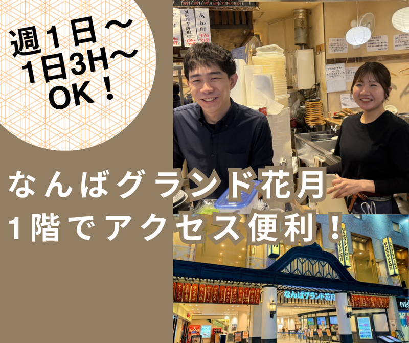 求めている人材 【こんな方大歓迎】 ・未経験から始めたい方 ・わすれな草グループの人気店舗店で働きたい方 ・駅チカのなんばグランド花月1階で働きたい方 ・Wワーク・掛け持ちで稼ぎたい方 ・扶養控除内で働きたい方 ・時間を有効活用しながら稼ぎたい方 ・週1日~・1日3時間~の勤務がしたい方 【特に求めています】 ・飲食業界での経験者の方 ・ゆくゆくは、正社員で働きたい方 【みなさんOK】 学歴・年齢など一切不問です! (ほとんどのスタッフは、業種・職種未経験スタートです。) 20代、30代、40代、50代の男女スタッフが幅広く活躍中! 業種・職種未経験者歓迎! ・大学生・短大生・専門学生・フリーター・主婦パートが活躍中です! ・Wワーク大歓迎! 【こんな経験活かせます】 ・カフェ/焼き鳥/居酒屋(ホール/キッチン/調理補助) ・コンビニクルー/スーパーレジ ・美容院/病院/クリニック受付 ・在宅ワーク(SOHO)/内職/副業 【未経験者でも安心サポート!】 未経験者対応型の研修サポートで丁寧にお教えしていきます。 殆どのスタッフたちが、未経験から始めていらっしゃいます! 【こんな方たちも!】 短大・専門・大学を卒業したかけもちバイトさんやフリーターさんも大歓迎! プライベートと両立して超ベンリな「なんば・日本橋エリア」で働きませんか! ※学生さんは、特に接客やサービスなどの経験を活かして就活で役立てて頂けるようにサポートします!