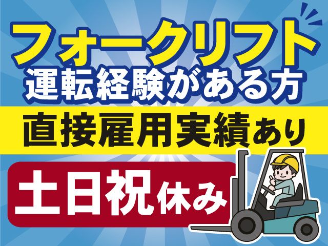 仕事内容 \ 高時給1,400円以上 / フォークリフト運転経験者、必見! 仕事とプライベートの両立がしやすい職場です。 将来的には正社員も目指せます!(直雇用実績あり) ▶ 日勤専属×土日祝休み ▶ 高時給1,400円~1,600円 ▶ 正社員登用実績あり <フォークリフトでの出荷・運搬作業> 製造工場内でフォークリフトを使用した運搬・荷積み業務をお任せします。 製品を出荷エリアまで運び、トラックへ積み込むのがメインのお仕事です。 運転しながら適度に体も動かせる、アクティブなポジションです。 ▼ 主な仕事内容 ・工場内での製品運搬 ・トラックへ製品の積み込み ※フォークリフト(カウンターバランス)を使用します ▼ 必要資格・スキル ・フォークリフト免許必須 ・カウンターフォークの運転経験者 < 職場環境・ポイント > ・20代~40代男性スタッフ中心に活躍中! ・チームワーク良好で作業しやすい環境 ・定着率高く、長期勤務者も多数 ・うれしい土日祝休み!週末の予定が立てやすい! ・長期休暇あり(GW・夏季・年末年始) ・正社員登用実績あり!将来性も◎ < 充実した教育制度あり > 工場や倉庫勤務経験が浅い方、ブランクがある方も安心! 教育制度が整っているので、丁寧にお教えします。 カウンターフォークの運転経験があれば大丈夫! 将来性を重視するあなたにピッタリのお仕事です。 ご応募をお待ちしています!